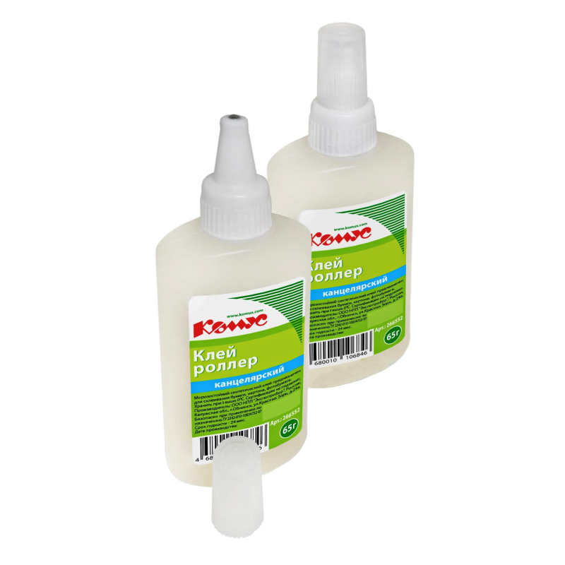 Канцелярский клей 'Комус' с аппликатором-роллером (шарик из нержавеющей стали), который обеспечивает легкое и равномерное нанесение. Объем - 65 мл, бесцветный. Применяется для склеивания бумаги, картона, декоративных и поделочных работ. Съемный колпачок предохраняет клей от засыхания. Клей морозостойкий. Выдерживает 4 цикла заморозки/разморозки при температуре до -30°С (длительностью не более 15 суток). Клей имеет консистенцию - гель.