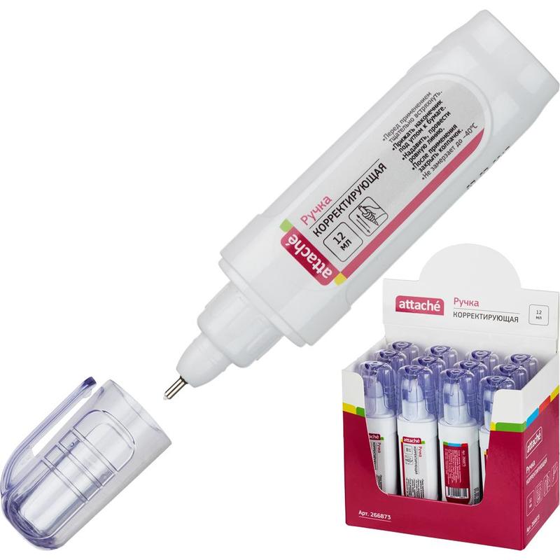 Корректирующий карандаш Attache, предназначен для исправления рукописного и машинописного текста. Объем флакона — 12 мл. Металлический шариковый узел позволяет наносить линии толщиной 1,4 мм. Перед применением корректирующий карандаш необходимо тщательно взболтать.