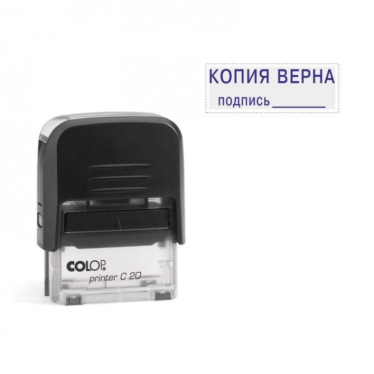 Штамп стандартный Colop Printer C20 3.42 позволяет получить оттиск со словами «КОПИЯ ВЕРНА» и полем для подписи. Выполнен в современном дизайне. Компактный надежный пластиковый корпус с поворотным окрашивающим механизмом. Размер оттиска — 38×14 мм. Прозрачное основание позволяет удобно и точно размещать штамп на документах. Комплектация: штамп, синяя сменная штемпельная подушка E/20.