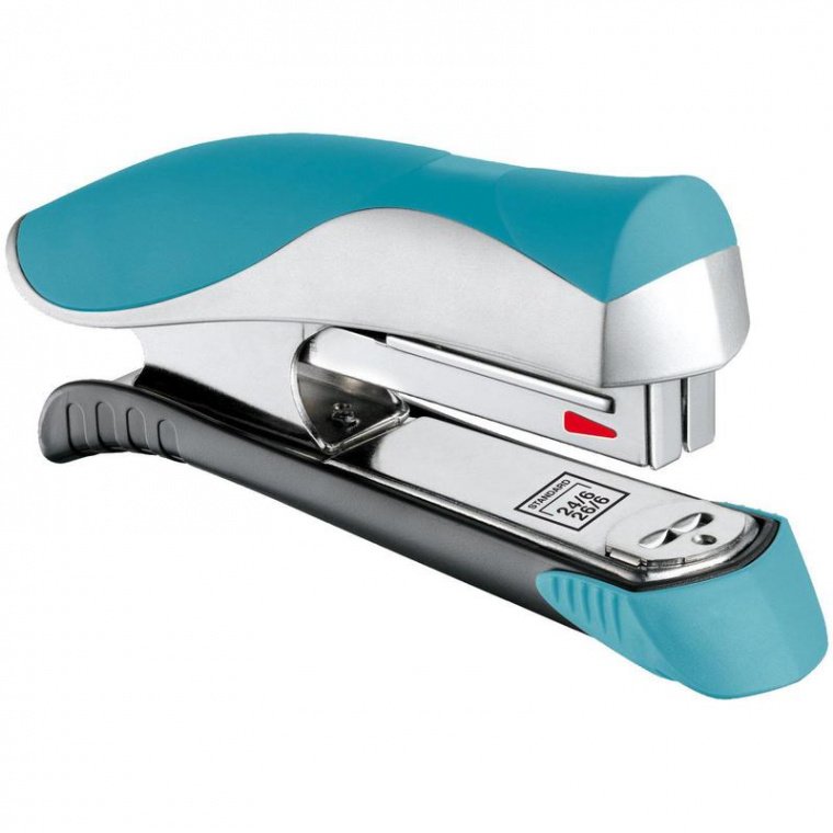 Эргономичный настольный степлер средний Maped Ergologic одновременно сшивает до 25 листов: плотность бумаги 80 гр/м.кв — 20 листов, плотность бумаги 70 гр/м.кв — 25 листов. Адаптирован к геометрии руки. Мягкие материалы в зоне давления. Удобное отделение для запасных скоб + скобы в комплекте (в отделении для запасных скоб). Механизм защиты от застревания скоб. Металлический толкатель. Позволяет производить сшивание закрытым способом. Максимальная глубина закладки бумаги составляет 60 мм (6 см). Цвет корпуса — серебристый/бирюзовый/черный. В степлере используются скобы № 24/6, 26/6. Вместимость скоб: 100 шт 24/6 или 130 шт 26/6. Гарантия 10 лет.