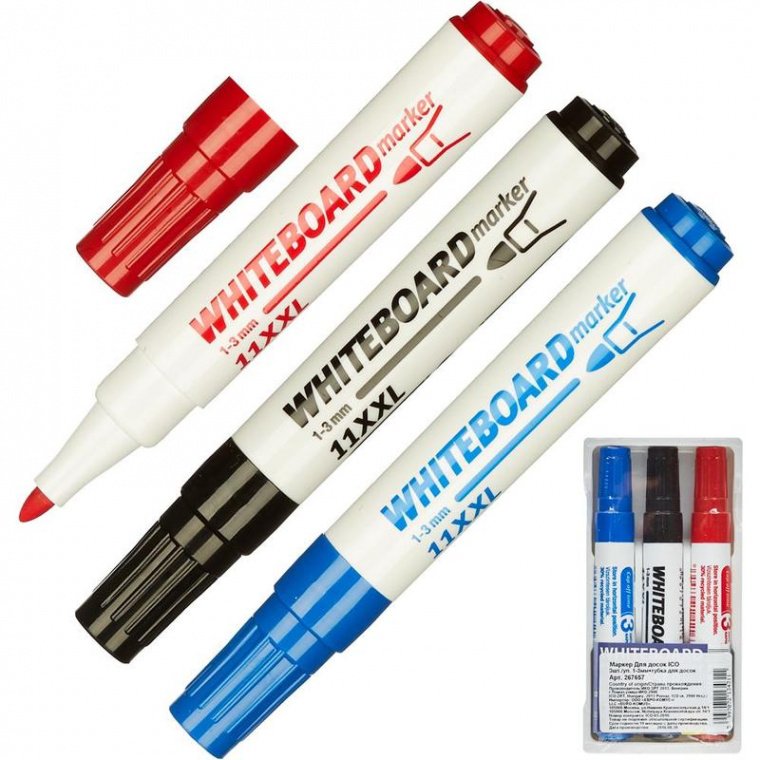 В набор входит 3 маркера для досок с круглым наконечником губка для досок в виде подставки для маркеров.