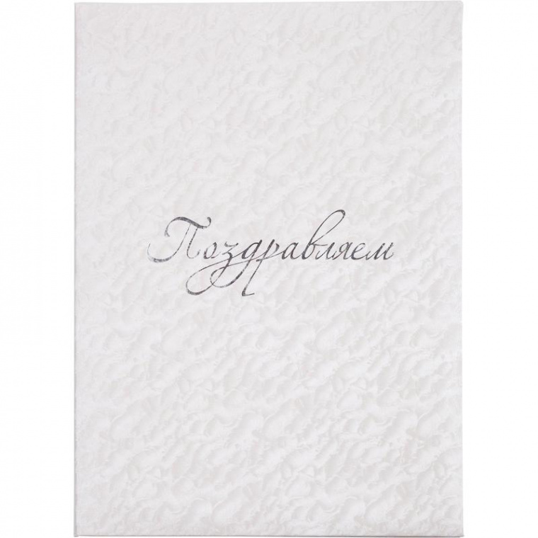 Адресная папка формата А4 выполнена из балакрона (ПВХ с имитацией кожи) белого цвета. На обложке надпись «Поздравляем», выполненная методом тиснения золотистой фольгой. Внутри цветные вклейки и фиксирующая ленточка для поздравительного документа.