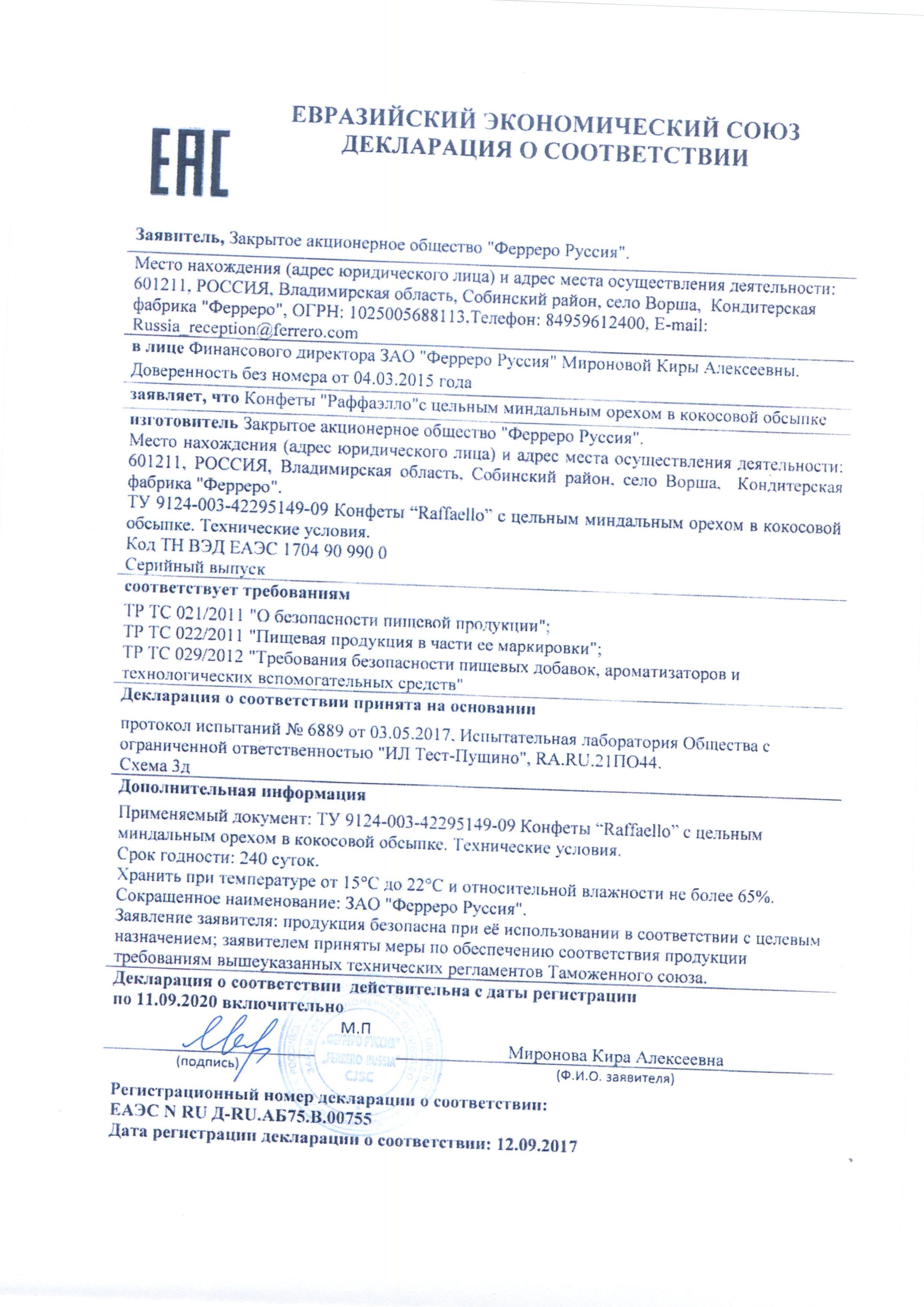 Сертификат на товар - Конфеты Raffaello с миндалем 240 г