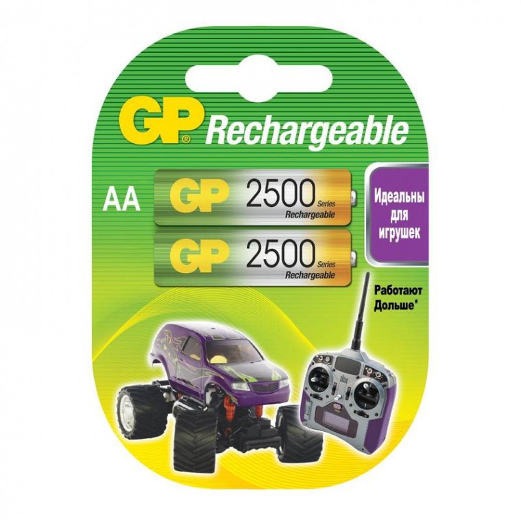 Аккумуляторные батарейки GP АА НR6никель-металлогидридныеNi-Mh, номинальная емкость 2500 мАч, время полной зарядки 16 часов, максимальное количество подзарядок 1000. Стабильная работа в широком диапазоне температур (от −20 до +50 С). Отсутствует эффект памяти (нет необходимости разряжать аккумуляторы перед зарядом). Количество аккумуляторов в упаковке — 2 штуки.