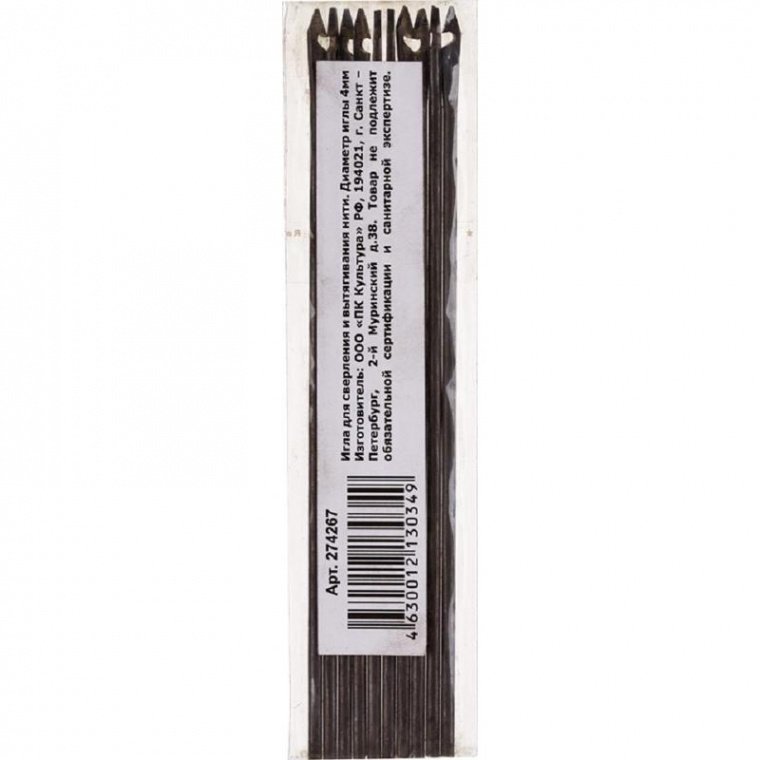 Игла предназначена для использования в станках для архивного переплета Юнгер М168, 268, Express-2, Express-3, Express-5. Высверливает отверстия в подшиваемом документе и продевает в них нить. Отличается надежностью и точностью в работе. Длина иглы — 14 см, фактический диаметр составляет около 3,8 мм, диаметр получаемых отверстий — 4 мм. В комплекте поставки 10 штук.