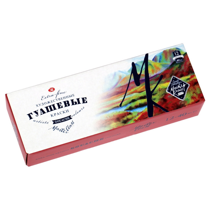 При изготовлении гуаши "Мастер-Класс" используются тонко тертые пигменты, белила и связующие вещества (в том числе гуммиарабик). Белила придают гуаши матовость, позволяют краскам ровно ложиться на поверхность, покрывая ее без просветов. В составе большинства оттенков всего один пигмент, поэтому краски отличаются чистотой цвета и сохраняют яркость после нанесения. Краски изготовлены из качественных пигментов, среди которых пигменты собственного производства (кадмиевые и кобальтовые пигменты, красящие земли). Подходят для художественных и декоративных работ: хорошо ложатся на холст, картон, бумагу. Ими можно работать на таких поверхностях, как металл, дерево, кость, пластмасса, стекло, кожа. Подходят для реставрационных работ. Набор гуаши "Мастер-Класс" состоит из 12 базовых цветов, необходимых художнику для работы. Баночки 40 мл упакованы в картонную коробку. В набор входят следующие цвета: белила цинковые, желтая светлая, охра золотистая, краплак красный, красная, лазурь железная, ультрамарин, фиолетовая темная, ярко-зеленая, зеленая темная, умбра жженая, сажа газовая. Размер упаковки: 27х9.5х5.5 см.