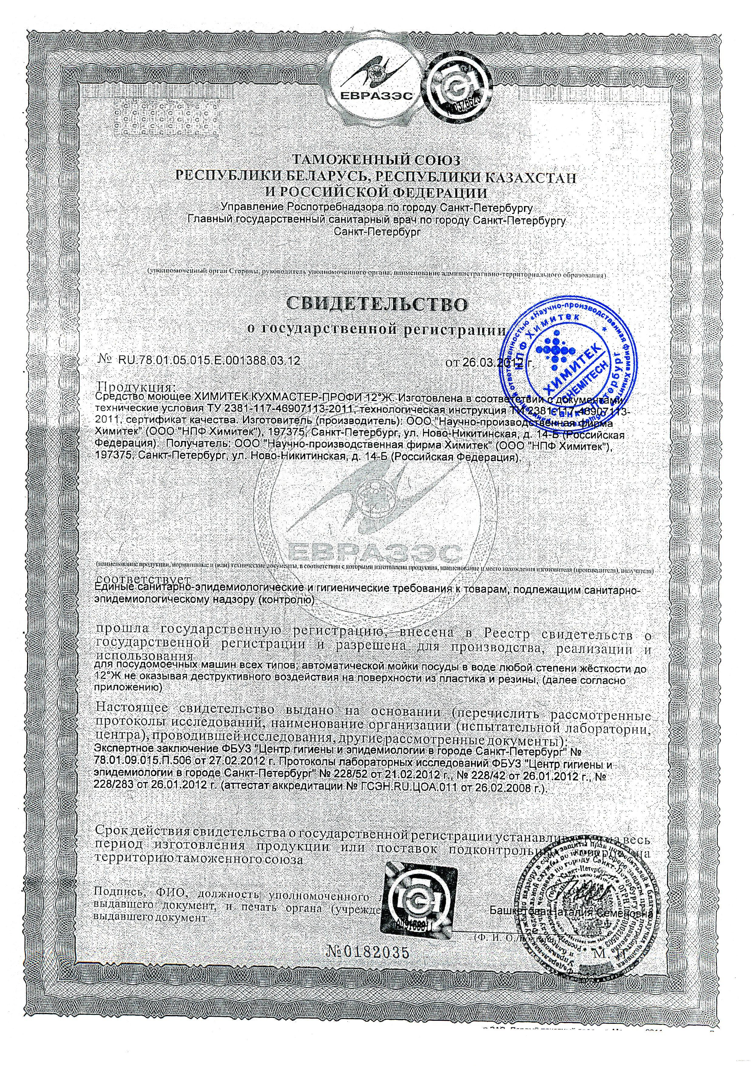 Сертификат на товар - Средство для мытья посуды в посудомоечной машине Химитек Кухмастер-Профи 12°Ж 5 л (концентрат)