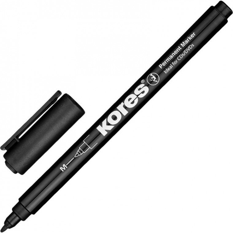 Перманентный маркер Kores в пластиковом корпусе. Нестираемые чернила обладают повышенной светостойкостью. Подходят для нанесения надписей на CD/DVD. Тонкий наконечник круглой формы обеспечивает толщину линии до 1 мм. Маркер оснащен вентилируемым колпачком, который предотвращает высыхание наконечника. Страна производства — Чешская Республика. Цвет — черный.