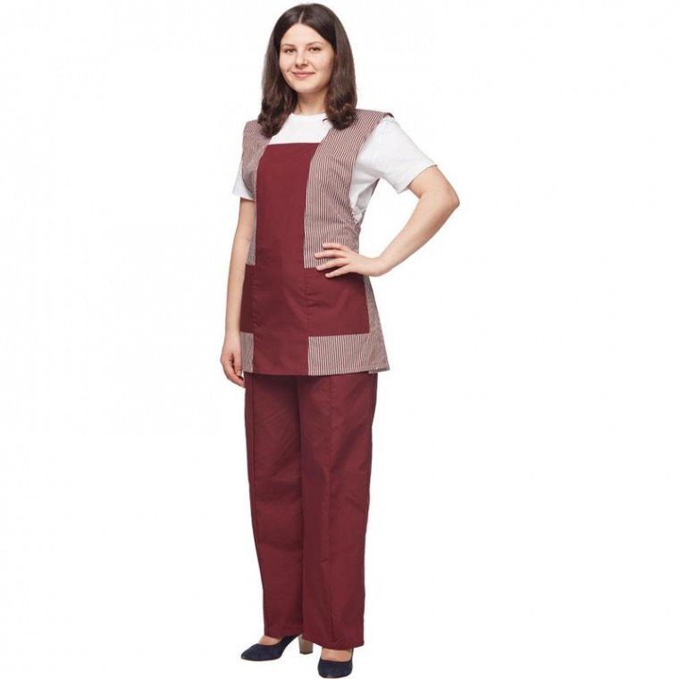 Костюм для горничных и уборщиц у08-СБР, цвет бордовый (размер 56-58, рост 158-164), включает фартук-сарафан и брюки. Фартук с накладными карманами, по талии регулируется боковыми завязками. Отделка — вставки контрастного цвета. Размер накладных карманов — 17×17 см. Брюки умеренного объема на резинке с отстроченной стрелкой. Женский костюм изготовлен из смесовой ткани Ти-Си (65% полиэфир, 35% хлопок). Ти-Си — материал, приятный на ощупь, гигиеничен и долговечен. Не мнется, легко и быстро стирается, быстро сохнет. Долго сохраняет свой первоначальный яркий цвет. Ткань «дышит», благодаря входящему в состав хлопку, имеет повышенный срок службы и проста в уходе, благодаря полиэфиру. Плотность: 120 г/кв. м. Стирать при температуре не выше 40 градусов. Униформа рекомендована для сферы обслуживания, клининга, гостиничного бизнеса.