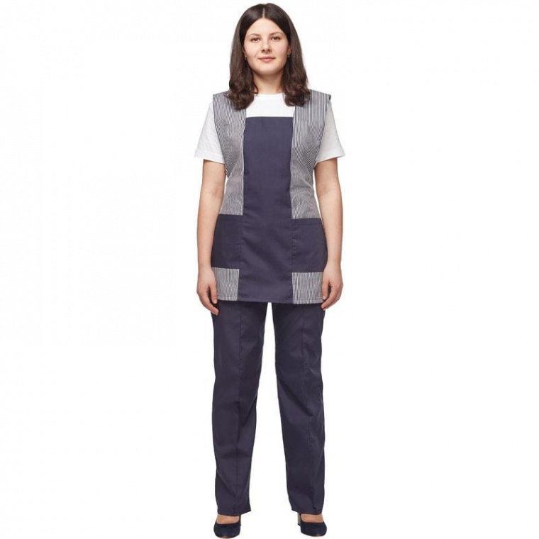 Костюм для горничных и уборщиц у08-СБР, цвет синий, включает фартук-сарафан и брюки. Фартук-сарафан с накладными карманами регулируется по талии боковыми завязками. Отделка — вставки контрастного цвета. Размер накладных карманов — 17×17 см. Брюки среднего объема с отстроченной стрелкой на резинке. Женский костюм изготовлен из смесовой ткани Ти-Си (65% — полиэфир, 35% — хлопок), ткани средней плотности — 120 г/кв. м. Ти-Си — материал, приятный на ощупь, гигиеничен и долговечен. Не мнется, легко и быстро стирается, быстро сохнет. Долго сохраняет свой первоначальный яркий цвет. Ткань «дышит», благодаря входящему в состав хлопку, имеет повышенный срок службы и проста в уходе, благодаря полиэфиру. Размер 48-50, рассчитан на рост 158-164 см. Стирать при температуре не выше 40 градусов. Униформа рекомендована для сферы обслуживания, клининга, гостиничного бизнеса.
