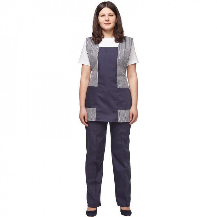 Костюм для горничных и уборщиц у08-СБР, цвет синий (размер 48-50, рост 170-176), включает фартук-сарафан и брюки. Фартук с накладными карманами, по талии регулируется боковыми завязками. Отделка — вставки контрастного цвета. Размер накладных карманов — 17×17 см. Брюки умеренного объема на резинке с отстроченной стрелкой. Женский костюм изготовлен из смесовой ткани Ти-Си (65% полиэфир, 35% хлопок). Ти-Си — материал, приятный на ощупь, гигиеничен и долговечен. Не мнется, легко и быстро стирается, быстро сохнет. Долго сохраняет свой первоначальный яркий цвет. Ткань «дышит», благодаря входящему в состав хлопку, имеет повышенный срок службы и проста в уходе, благодаря полиэфиру. Плотность: 120 г/кв. м. Стирать при температуре не выше 40 градусов. Униформа рекомендована для сферы обслуживания, клининга, гостиничного бизнеса.
