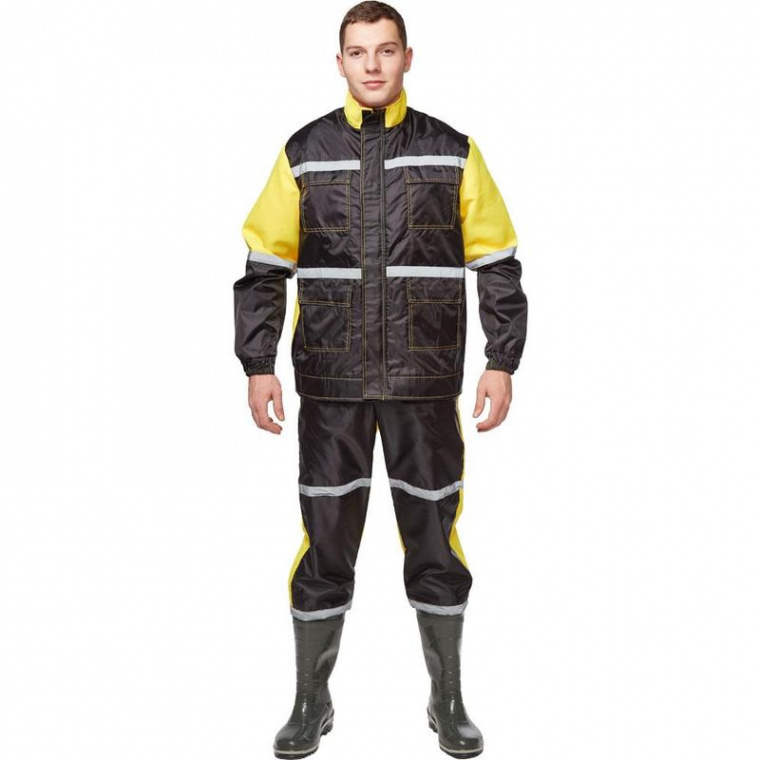 Спецкостюм «Мойщик-2» черно-желтого цвета из смесовой ткани (65% полиэфир, 35% хлопок) оснащен водоотталкивающими накладками из ткани «Оксфорд» (100% полиэфир). В комплект входят полукомбинезон и куртка. Куртка на молнии с супатной застежкой на липучке. В полукомбинезоне имеются внутренние манжеты, предохраняющие обувь от попадания влаги. По центру спины комбинезона находится вентиляционная сетка. К костюму пришиты опознавательные световозвращающие ленты. Размер мужского спецкостюма 44-46, рассчитан на рост от 182 до 188 см.