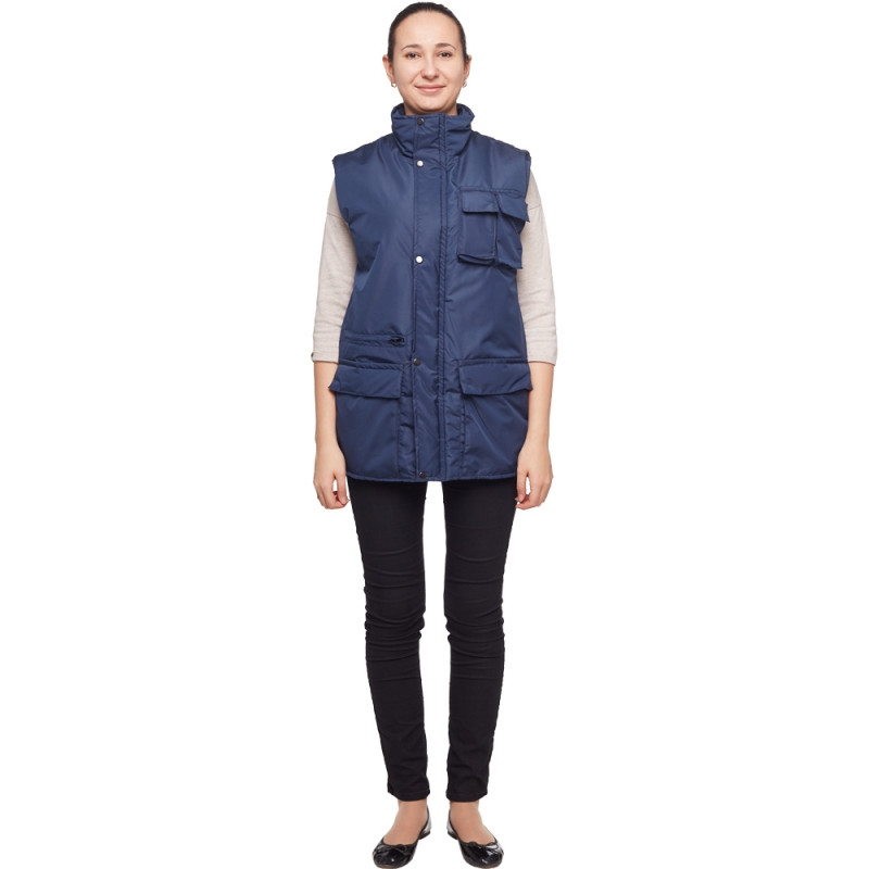 Жилет утепленный 'Товаровед' (размер 52-54, рост 170-176) синий с застежкой на молнию с ветрозащитным клапаном на кнопках. Подходит для работ в прохладных помещениях или на улице. Максимально низкая температура, при которой возможно использование данного жилета, составляет -10 градусов Цельсия. Жилет универсален, он может быть использован в качестве униформы для женщин и для мужчин. Удобные карманы для равномерного распределения необходимых в работе инструментов. Два нагрудных кармана под телефон и другие мелочи. Карман на молнии под листочку. Накладные карманы с клапанами на липучке. Ткань верха: таслан 330D (189 Т) - 100% нейлон. Плотность ткани: 110 г/кв.м. Ткань подкладки: 100% полиэстер. Утеплитель: синтепон - 250 г/кв.м. Защищает от общих производственных загрязнений.Коллекция Товвровед представлена утепленными жилетами красной и синей расцветок.