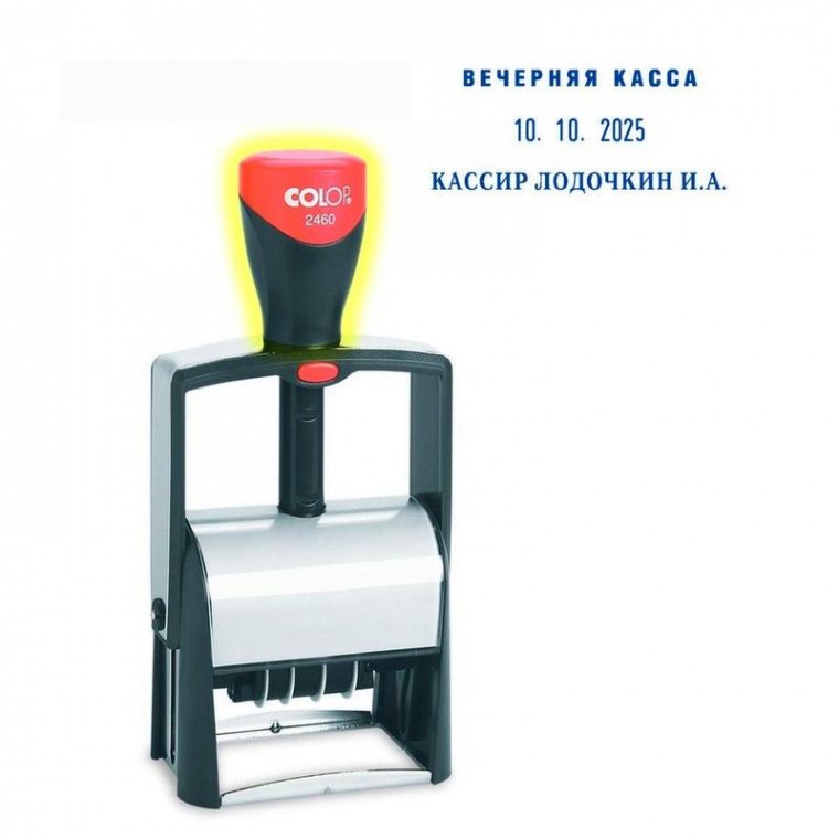 Датер автоматический со своб.полем металл. S2460Bank 58×27 мм, дата ЦИФР.4 мм Colop. Металлический каркас, обрамлен пластиком со встроенной антибактериальной защитой3G-серебра в ручке и колпачке. Автоматическое окрашивание текста. Предназначен для работы с повышенной нагрузкой. Мягкость и бесшумность хода, легкий доступ к колесам смены даты. Ленты датерных механизмов закрыты специальным кожухом, который гарантирует абсолютную чистоту в процессе использования. Дата — в центре, вокруг даты свободное поле под изготовление клише, рассчитана на 12 лет, включая текущий год. В комплекте: датер цифровой (формат01.01.2020),