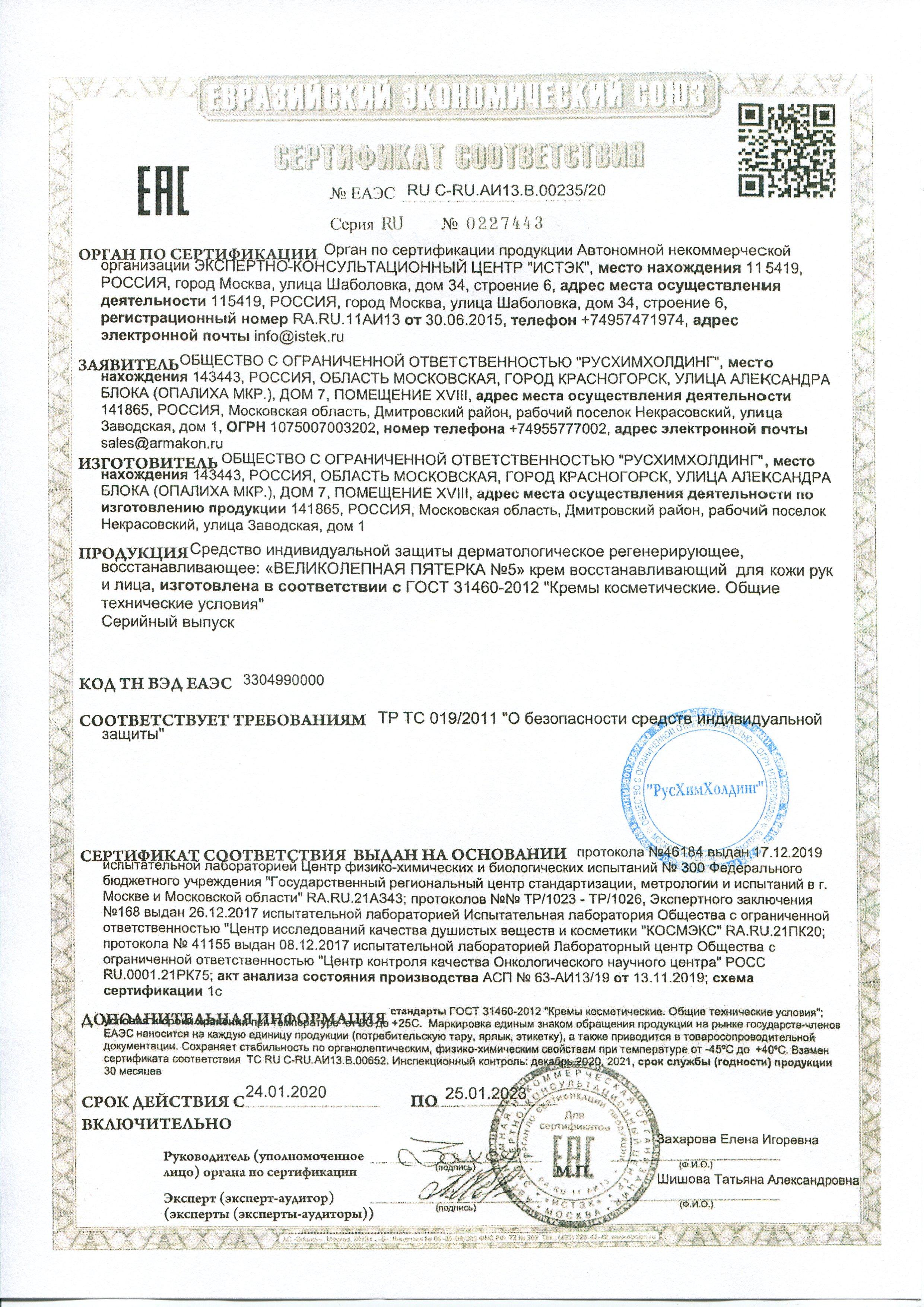 Сертификат на товар - Крем регенерирующий Великолепная Пятерка 5 100 мл