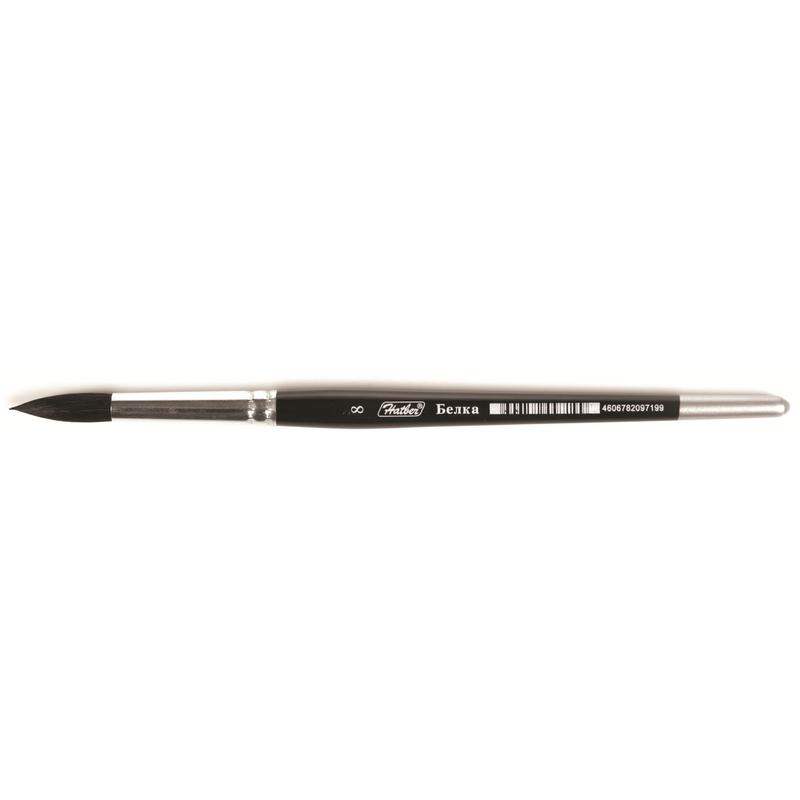 Кисть Hatber белка круглая № 8. Волос белки чрезвычайно мягкий и упругий, прекрасно набирает воду и краску, хорошо отдает ее на бумагу, при этом не 'полосит' и не портит ее. Кисти применяются в акварельной живописи по бумаге и в живописи по фарфору. Одной кистью № 8 можно рисовать целую картину - сделать заливку фона кистью 'плашмя', а острым кончиком нарисовать детали. Кисть имеет короткую (18.5 см), деревянную ручку, покрытую лаком. Ручка кисти оснащена защитным колпачком. Поставляется без упаковки.