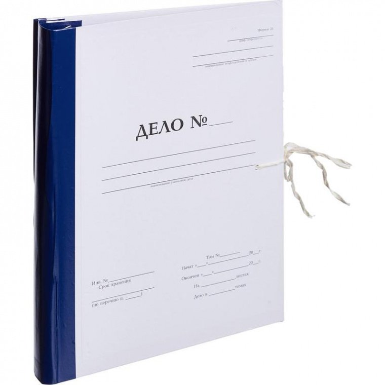 Архивная папка ’Дело №’ формата А4 выполнена из плотного картона, покрытого офсетной бумагой, толщина 1,5 мм. Корешок шириной 50 мм — из бумвинила (слой ПВХ на бумажной основе). Внутренние гребешки с 8 отверстиями позволяют подшивать документы с помощью тесьмы или механизма-скоросшивателя. В закрытом виде папка фиксируется двумя завязками. Вмещает до 500 листов стандартной плотности. В одной транспортировочной коробке содержится 35 папок, общий вес — около 8,5 кг. Размер внешний — 228×50×310 мм. Размер внутренний — 224×48×310 мм.