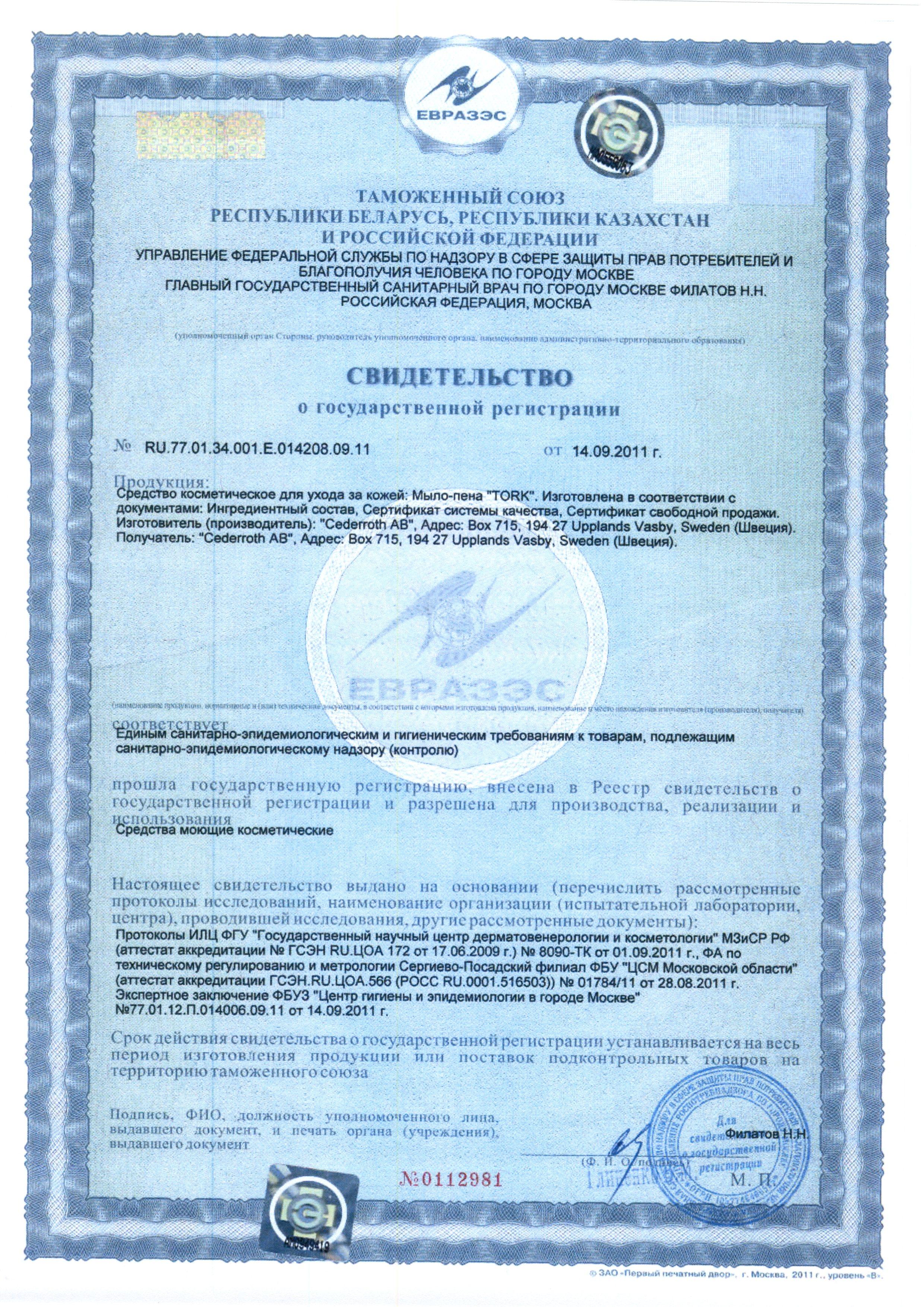 Сертификат на товар - Картридж с жидким мылом-пеной Tork S4 мягкое 520501 1 л