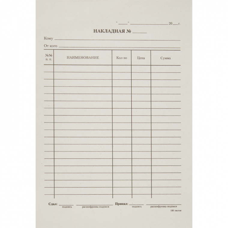 Бухгалтерские бланки — накладная. Применяются для оформления перехода права собственности на товар от продавца к покупателю. Бланки отпечатаны на газетной бумаге формата А5, склеены по 100 штук в виде книжки. В комплекте 20 книжек (упакованы в крафт-бумагу).
