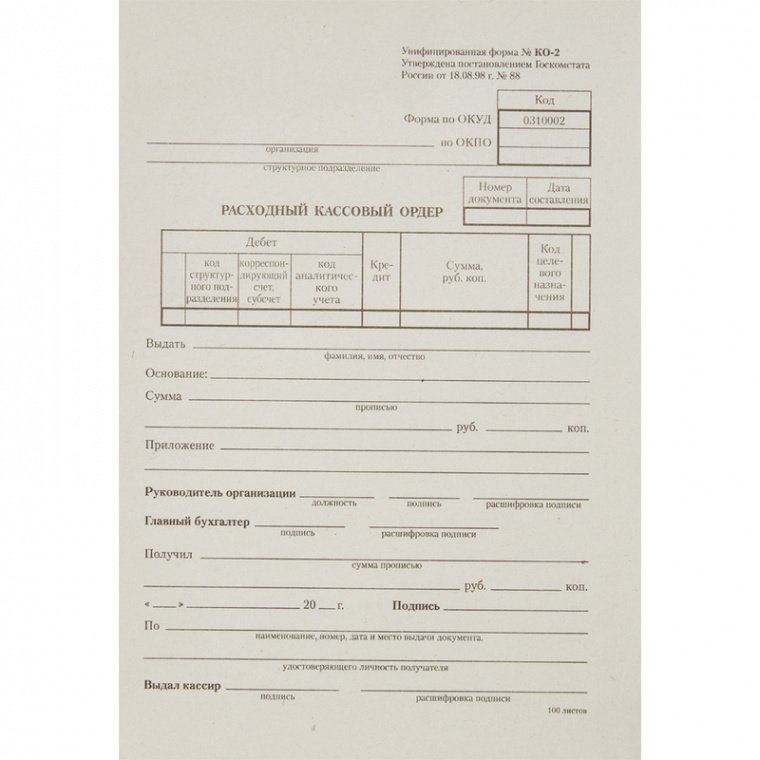 Бухгалтерские бланки — расходный кассовый ордер, унифицированная форма КО-2. Применяются для учета и оформления кассовых операций на предприятии. Бланки отпечатаны на газетной бумаге формата А5, склеены по 100 штук в виде книжки. В комплекте 20 книжек (упакованы в крафт-бумагу).
