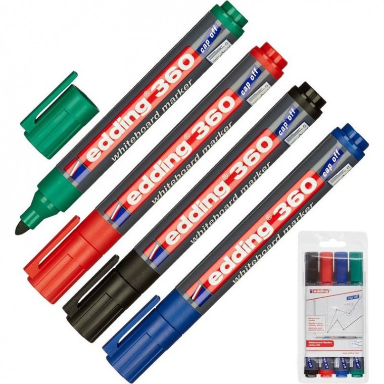 Набор маркеров для досок Edding e-360/4S с технологией «cap off». Данные маркеры можно использовать на магнитно маркерных досках, а так же на флипчартах. Круглый наконечник. Пластиковый корпус. Толщина линии письма: 2.2 мм Цвета: черный, синий, красный, зеленый. Размер упаковки 168×80×16 мм. Стираются сухой губкой. Производство — Германия.