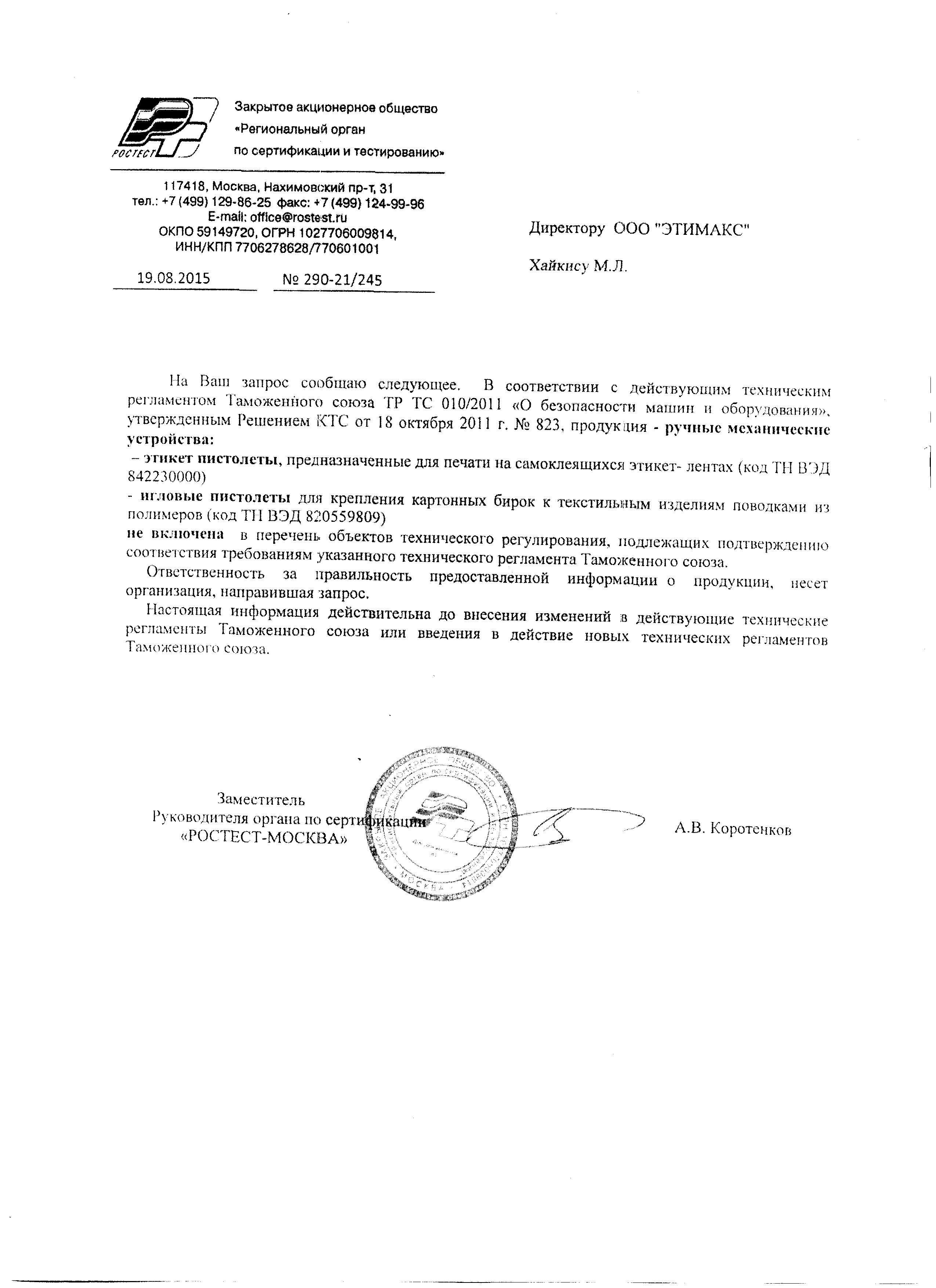 Сертификат на товар - Этикет-пистолет MoTEX MX-2612 однострочный (волнистая лента, 9 символов, 26x12 мм)