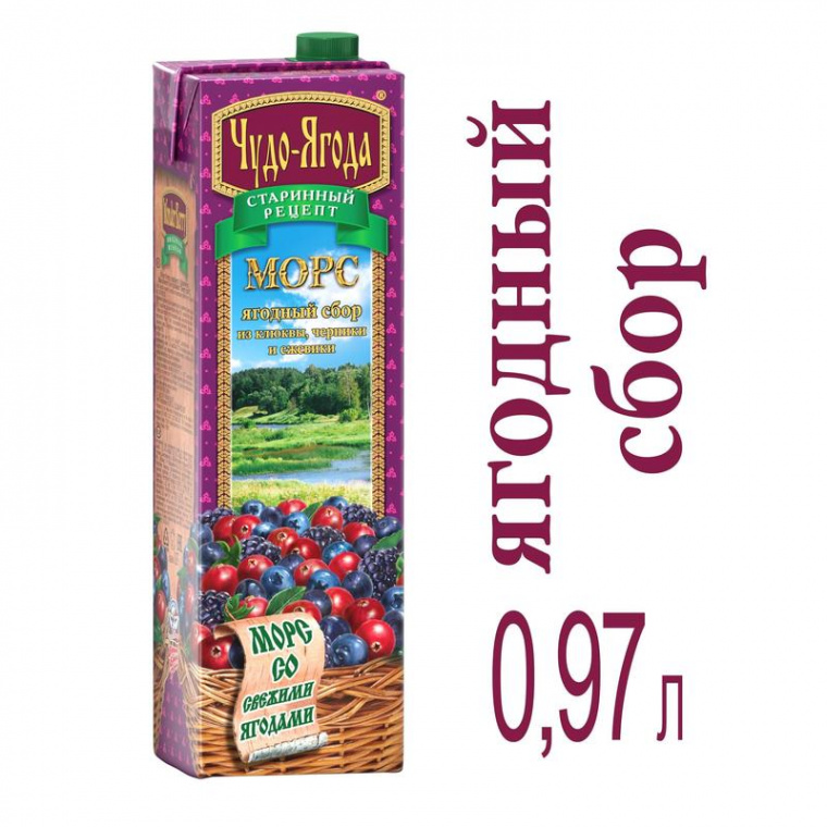 Морс Чудо-Ягода ягодный 0.97 л. Настоящий морс со свежими лесными ягодами. Кисло-сладкий сбор из клюквы, черники и ежевики сочетает многочисленные полезные свойства этих ягод. Отлично утоляет жажду и поддерживает здоровье. Для питания детей от трех лет. Тип упаковки: картонный пакет;