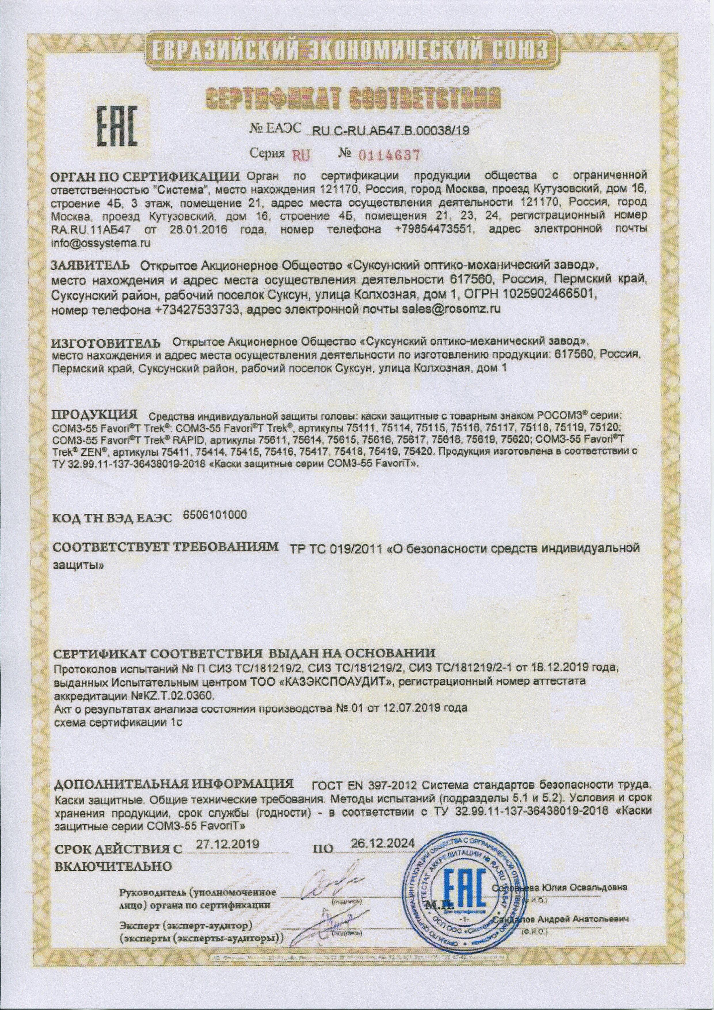Сертификат на товар - Каска Росомз СОМЗ-55 Favorit Trek оранжевая (артикул производителя 75114)