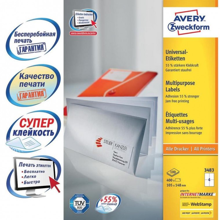 Этикетки самоклеящиеся Avery Zweckform белые 105х148 мм (4 штуки на листе A4, 100 листов, артикул производителя 3483)