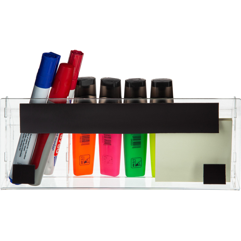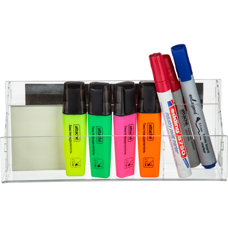 Держатель для маркеров из прозрачного оргстекла, два отделения для маркеров и магнитов. Размер держателя 240x100x53 мм. Ширина отсека под маркеры 170 мм, ширина отсека под губку 70 мм. Подходят все маркеры, универсальный отсек, специальная планка защищает от выпадания (расположена на высоте 6-8 см). В комплекте магнитное крепление.