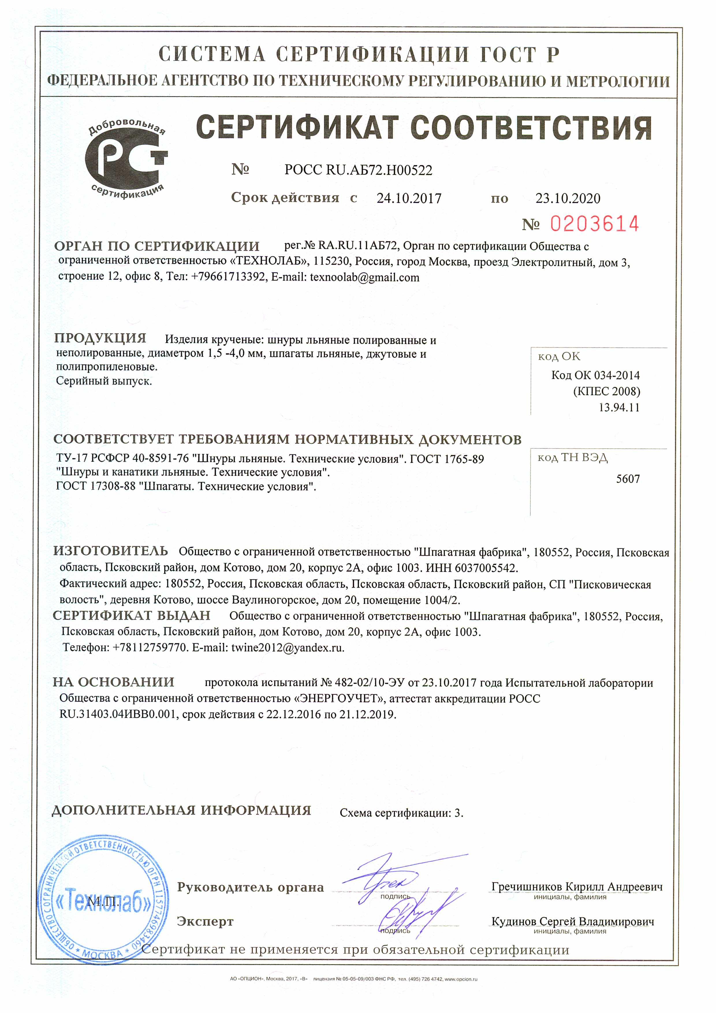 Льняной шпагат естественного темно-бежевого цвета. Полированный шпагат в бобине длиной 200 метров. Толщина — 2,4 миллиметра, плотность материала — 4,2 кТекс. Бобина весит 1 кг. Соответствует ГОСТу 17308-88.