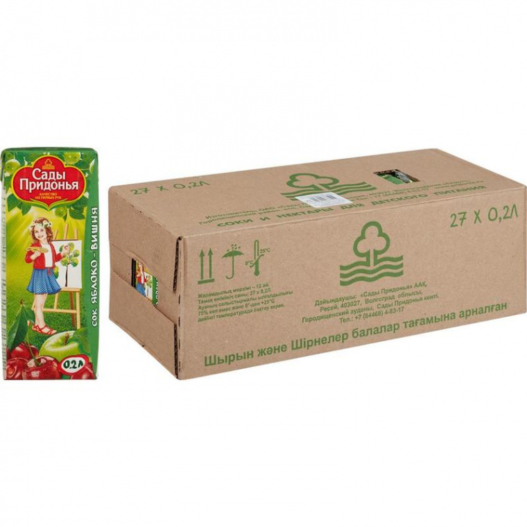 Сок Сады Придонья яблоко и вишня 0.2 л (27 штук в упаковке). Если и создала природа что-то особенно полезное для нашей кроветворной системы, так это вишню. В донской вишне высокое содержание фолиевой кислоты и особых веществ, флавоноидов (они придают ягоде характерную рубиновую окраску). Эти витамины незаменимы для обновления крови и поддержания хорошего уровня гемоглобина. Подходит для детского питания, изготавливается из экологически чистых ингредиентов. Поставляется в картонной упаковке, в каждой — 27 герметичных упаковок с пластиковыми трубочками. Удобный вариант для ребенка во время прогулок.