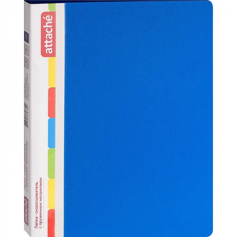 Папка-скоросшиватель Attache формата А4 изготовлена из пластика толщиной 0,7 мм. Цвет синий. Оснащена пружинным механизмом подшивания. На внутренней стороне обложки есть прозрачный карман для документов, компакт-дисков, визиток. Ширина корешка — 17 мм. Папка вмещает около 150 листов стандартной плотности.