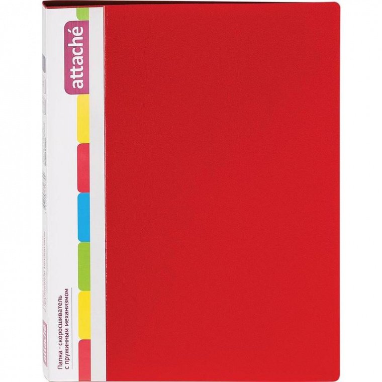 Папка-скоросшиватель Attache формата А4 изготовлена из пластика красного цвета, толщиной 0,7 мм. Оснащена пружинным механизмом подшивания. На внутренней стороне обложки есть прозрачный карман для документов, компакт-дисков, визиток. Ширина корешка — 17 мм. Папка вмещает около 150 листов стандартной плотности.