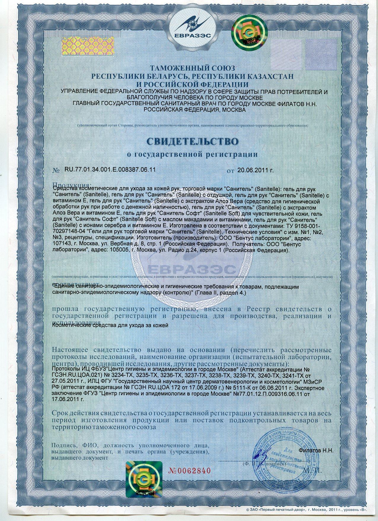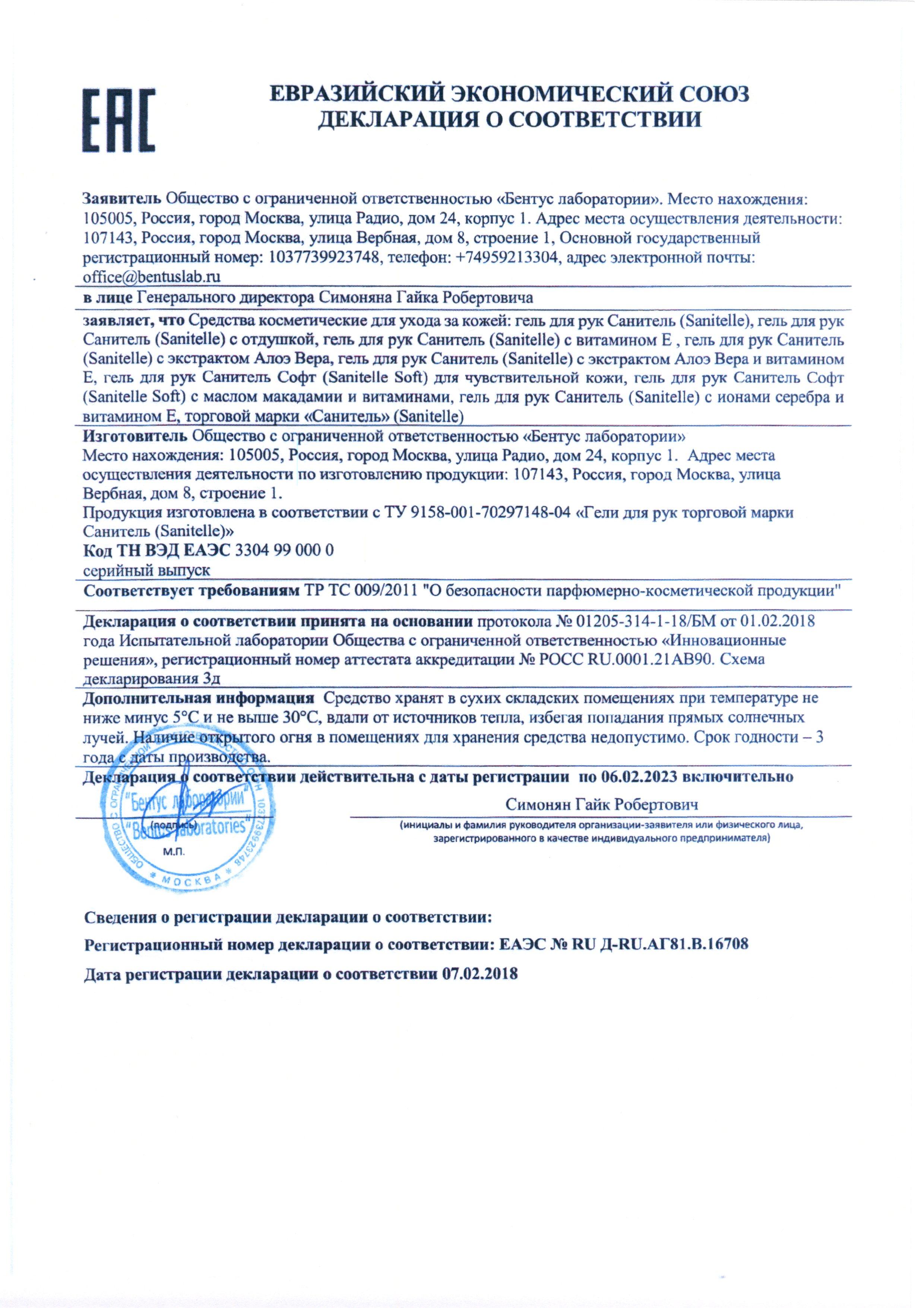 Сертификат на товар - Гель для рук антисептический Sanitelle с витамином Е 50 мл
