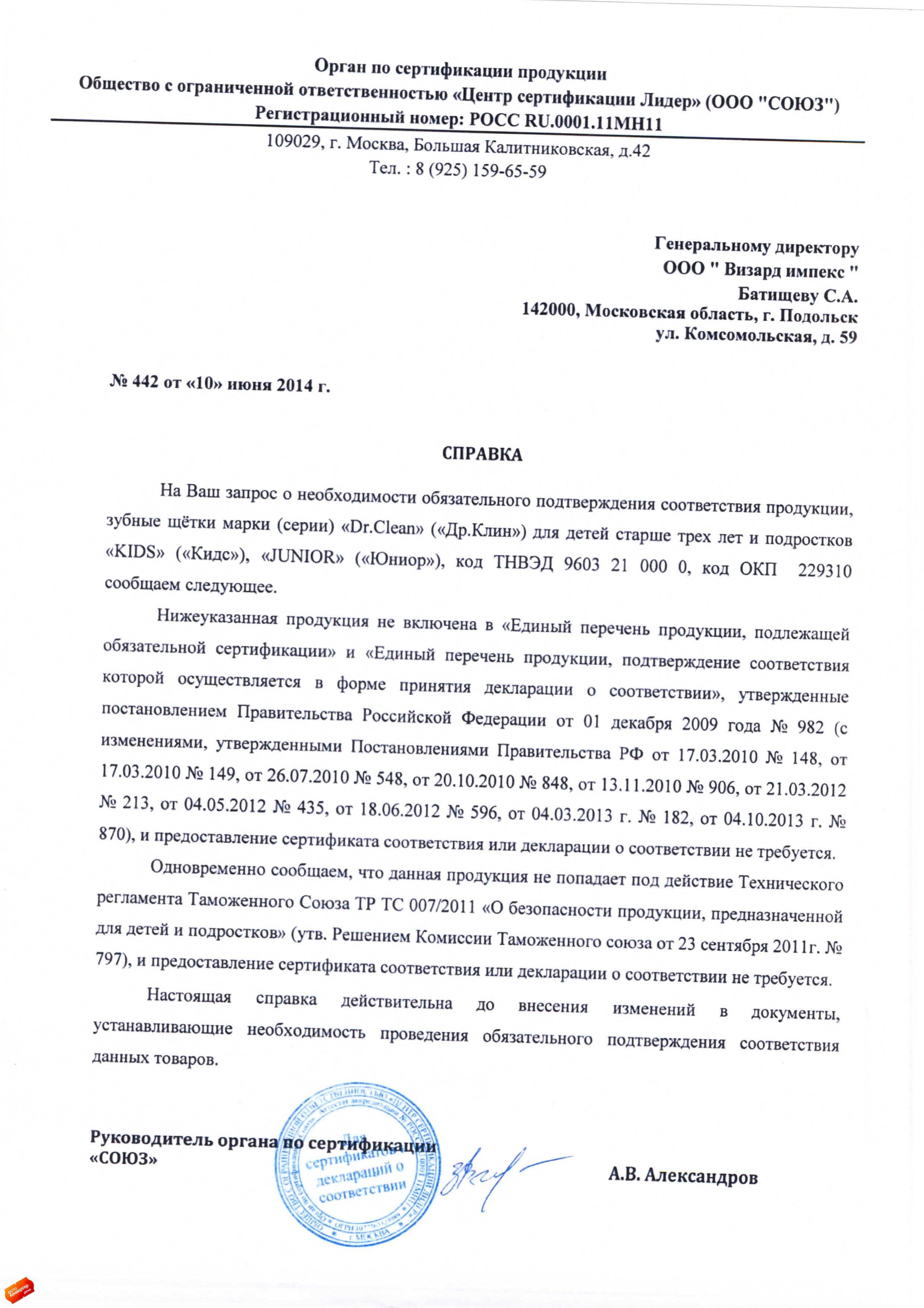 Сертификат на товар - Зубная щетка Dr.Clean средняя жесткость