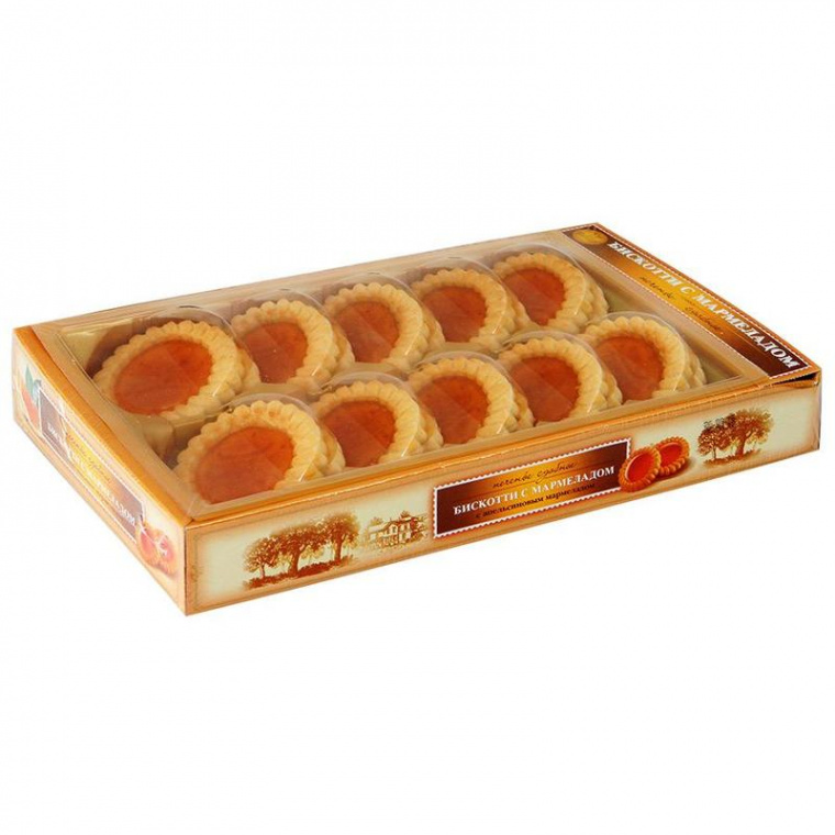 Печенье сдобное «Бискотти» с апельсиновым мармеладом — это изумительное печенье с хрустящей сдобной основой и ароматным апельсиновым мармеладом, сваренным из натурального фруктового сока. Утонченная кислинка безупречно гармонирует с рассыпчатой выпечкой и тонким слоем шоколада, даря приятные эмоции от наслаждения ярким десертом.
