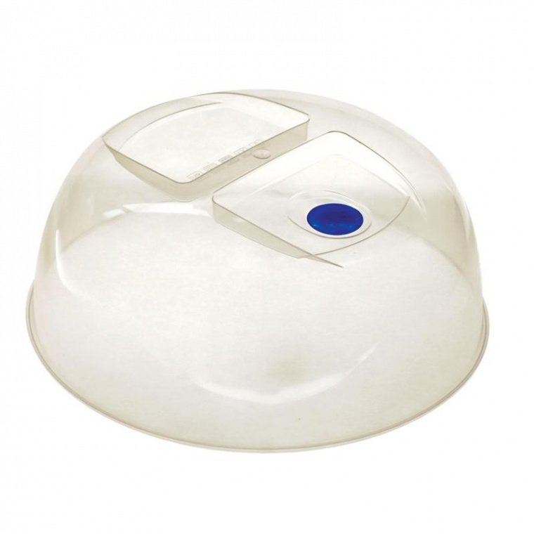 Крышка для микроволновых печей выполнена из термоустойчивого и безопасного пластика, предназначена для защиты внутреннего пространства от загрязнений и брызг. Изделие оборудовано специальным клапаном, закрывающим отверстие. При избыточном давлении под крышкой клапан автоматически открывается для отвода пара наружу.