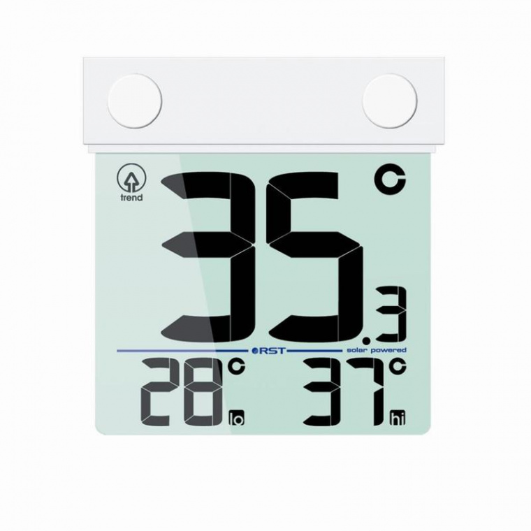 Цифровой термометр на липучке RST01389 в компактном корпусе с прозрачным дисплеем. Крепится с внешней стороны окна. Прибор оснащен системой контроля тенденции изменения температур и системой запоминания максимального и минимального значений за текущие сутки. Питание термометра осуществляется от встроенной солнечной батареи.