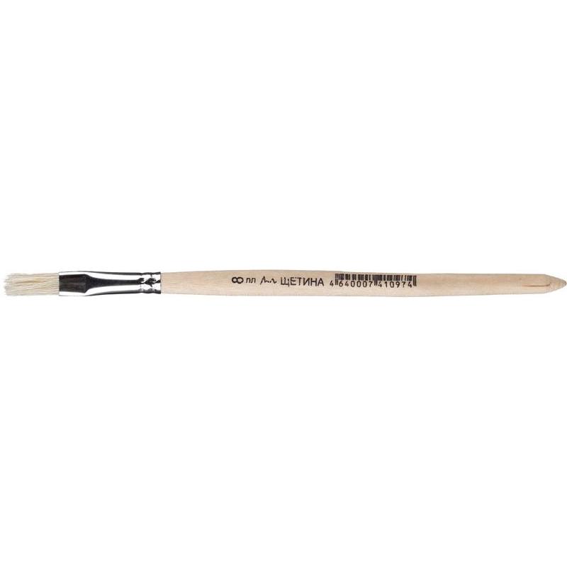 Кисть № 1 School щетина плоская № 8. Жесткая щетина отличается прочностью и упругостью, хорошо наполняется и удерживает краску. Кисть имеет короткую (18 см), деревянную ручку. Кисть предназначена для работ с маслом, тушью, акрилом. Поставляется без упаковки.