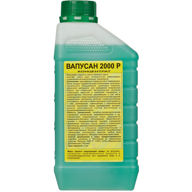 Дезинфицирующее средство 'Вапусан 2000' 1 л (концентрат). Химический состав дезсредства: ЧАС, вспомогательные компоненты. Действующие вещества: алкилдиметилбензиламмоний хлорид (АДБАХ) 4.9 %, алкилдиметилэтилбензиламмоний хлорид 4.9 %, вспомогательные компоненты. Сфера применения: акушерские стационары, ЛПУ, клинические лаборатории, станции переливания крови, детские учреждения (детсады, школы и т.п.), предприятия общественного питания, предприятия продовольственной торговли, коммунальные объекты (бани, бассейны, гостиницы, общественные туалеты и т.п.). Объекты обработки: белье нательное, белье постельное, гибкие эндоскопы, жесткая мебель, жесткие эндоскопы, ИМН из металлов, резин на основе натурального и силиконового каучука, стекла, пластмасс, ИМН обычные, инструменты к эндоскопам, инструменты стоматологические, поверхности в помещениях, предметы ухода за больными, резиновые и полипропиленовые коврики, санитарно-техническое оборудование, столовая посуда, уборочный инвентарь. Основные режимы применения средства (концентрация/время): дезинфекция поверхностей по бактериям, исключая туберкулез (0.5 %/60 мин., 1 %/30 мин.), дезинфекция поверхностей по вирусным инфекциям (2 %/60 мин., 3 %/30 мин.), дезинфекция поверхностей по кандидозу (2 %/60 мин., 3 %/30 мин.), дезинфекция поверхностей по дерматофитам (2 %/120 мин.), дезинфекция поверхностей по туберкулезу (3 %/90 мин.), дезинфекция ИМН при бактериальных, вирусных инфекциях и кандидозе (2 %/90 мин., 3 %/60 мин.), дезинфекция, совмещенная с ПСО ИМН при бактериальных, вирусных инфекциях и кандидозе (2 %/90 мин.). Класс опасности: при введении в желудок - 4; при нанесении на кожу - 4; рабочего раствора - 4. Активно в отношении: бактерии (Mycobacterium tuberculosi, грамотрицательные бактерии, грамположительные бактерии), вирусы (грипп, парагрипп, прочие возбудители ОРВИ), патогенные грибы (дерматофитон, кандида). Срок годности: в упаковке - 5 лет, в рабочем растворе - 14 дней. Страна производства: Россия.