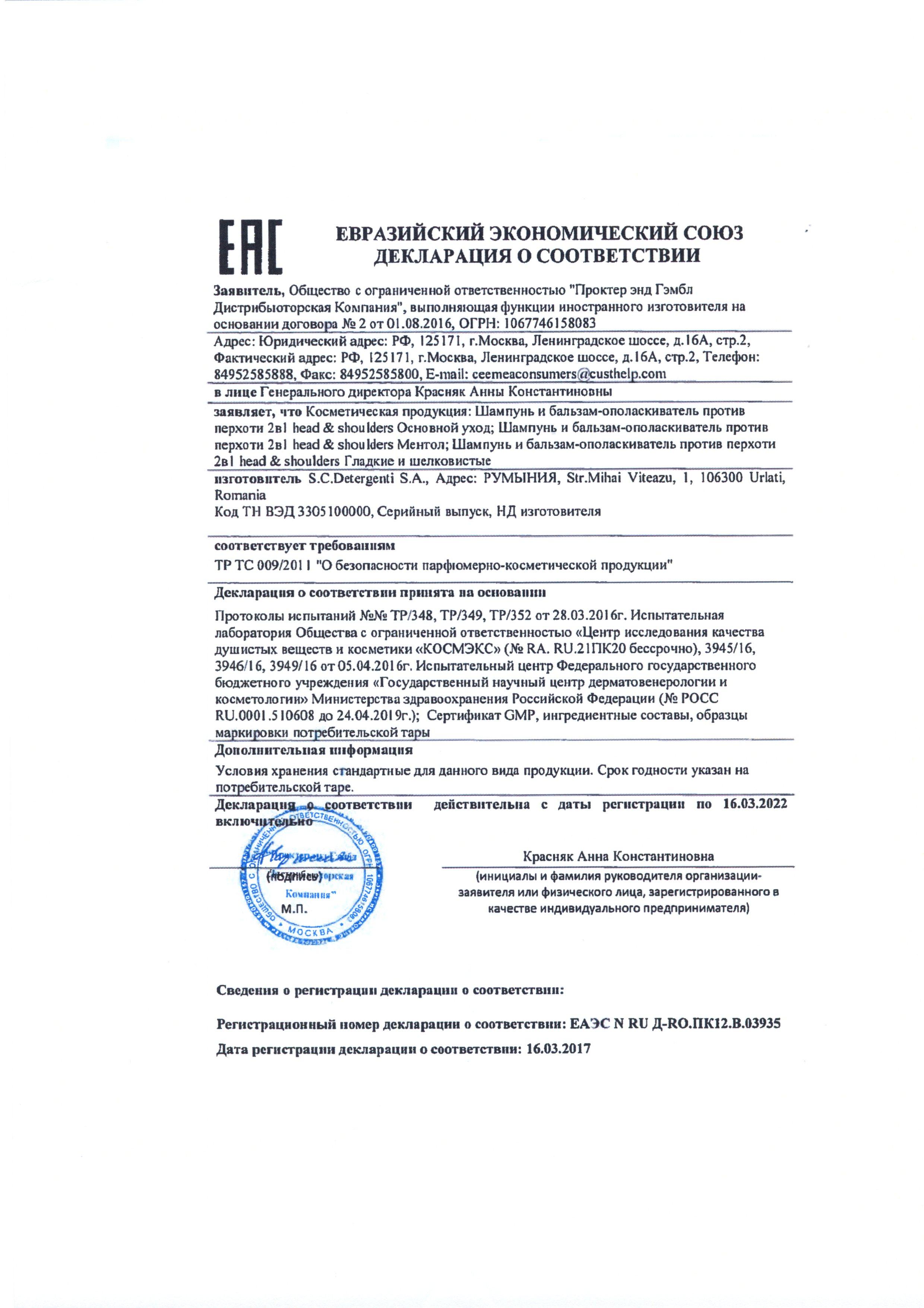 Сертификат на товар - Шампунь Head & Shoulders 2 в 1 для нормальных волос 400 мл