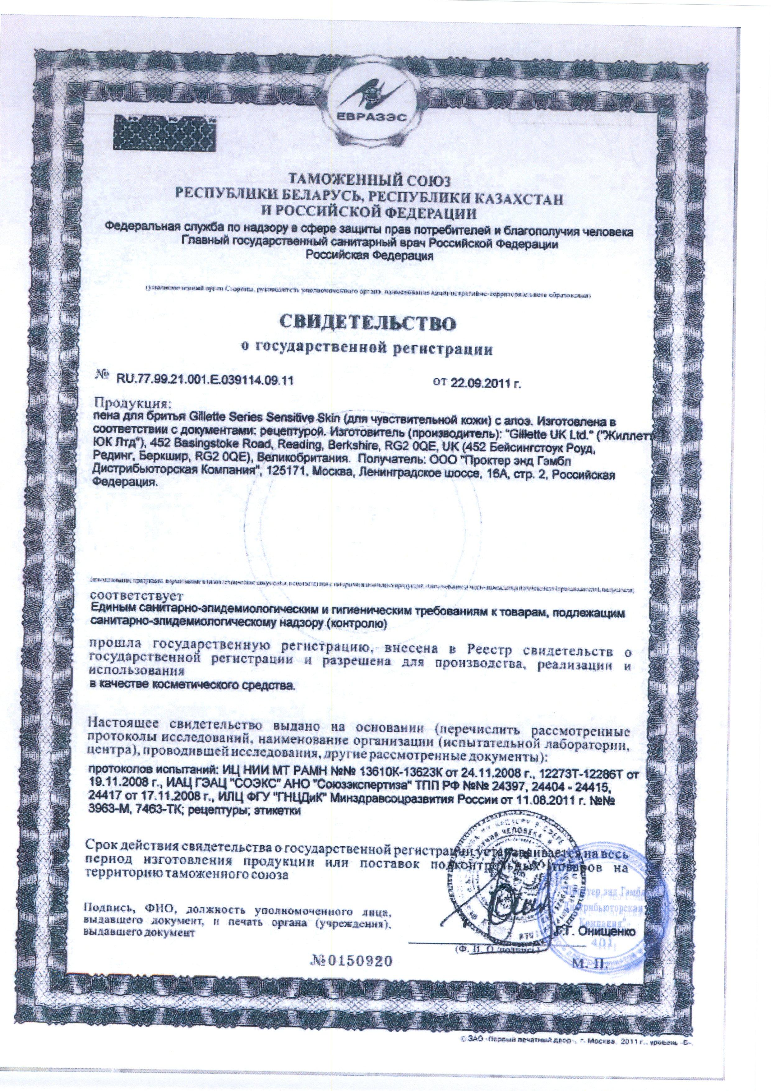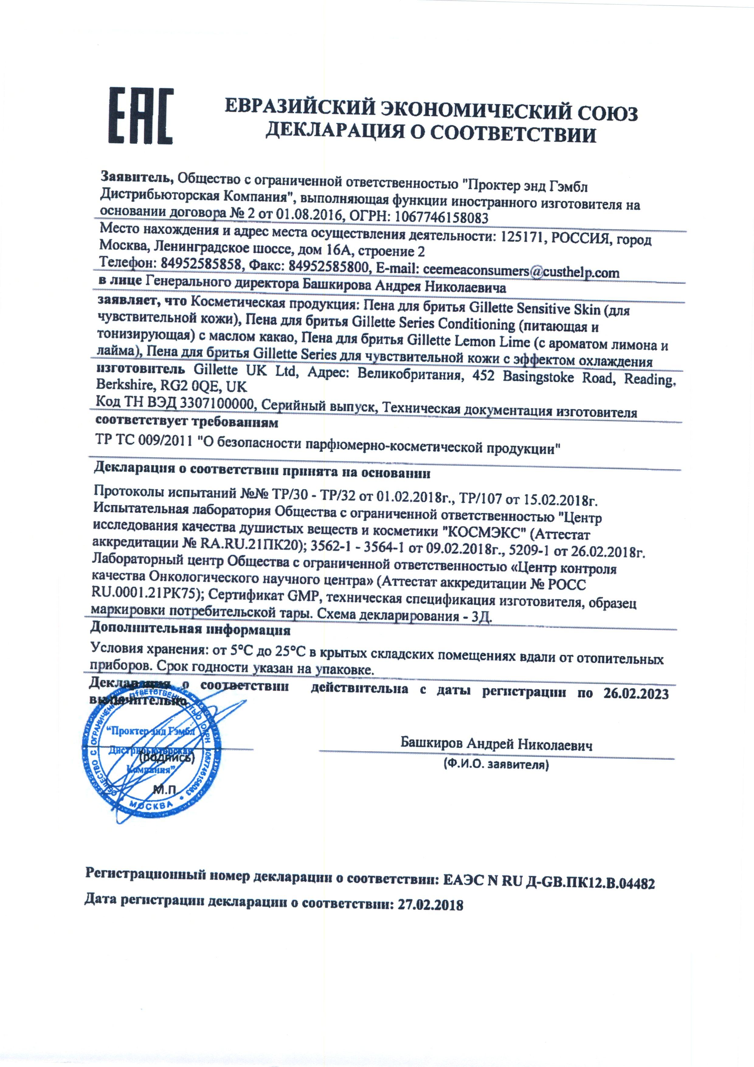 Сертификат на товар - Пена для бритья Gillette Sensitive Skin 200 мл