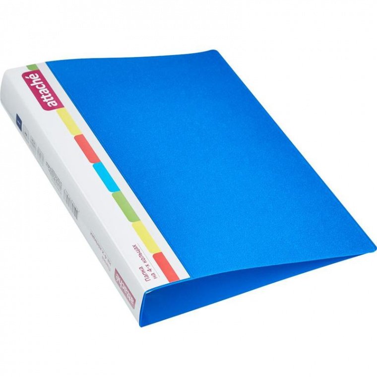Папка на четырех кольцах Attache изготовлена из пластика толщиной 0,7 мм синего цвета. Формат А4. Снабжена механизмом на четырех O-кольцах. Диаметр кольца — 35 мм. На внутренней обложке есть прозрачный карман для документов. Ширина корешка составляет 42 мм. На корешке есть наварной карман размером 9,5x30 см. Папка на кольцах вмещает до 200 листов стандартной плотности.