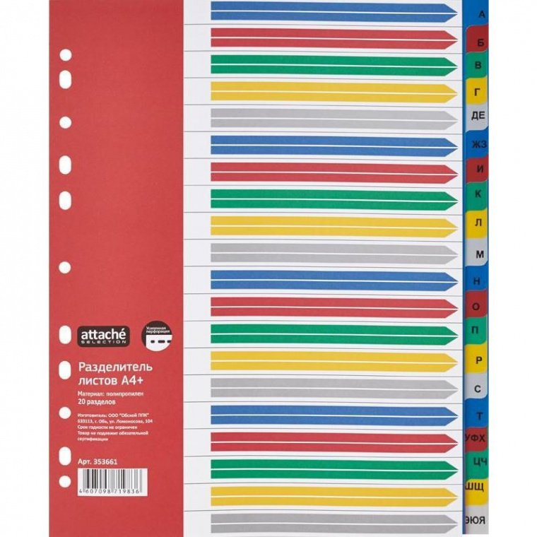 Разделители листов Attache Selection формата А4+ изготовлены из пластика толщиной 140 мкм. Размер — 230×320 мм. Предназначены для учета, классификации и удобной систематизации документов в архивных папках. Маркированы по алфавиту, облегчают поиск нужных позиций. Универсальная боковая перфорация совместима с кольцевыми и арочными механизмами. В комплекте 20 цветных разделителей листов и титульный лист.