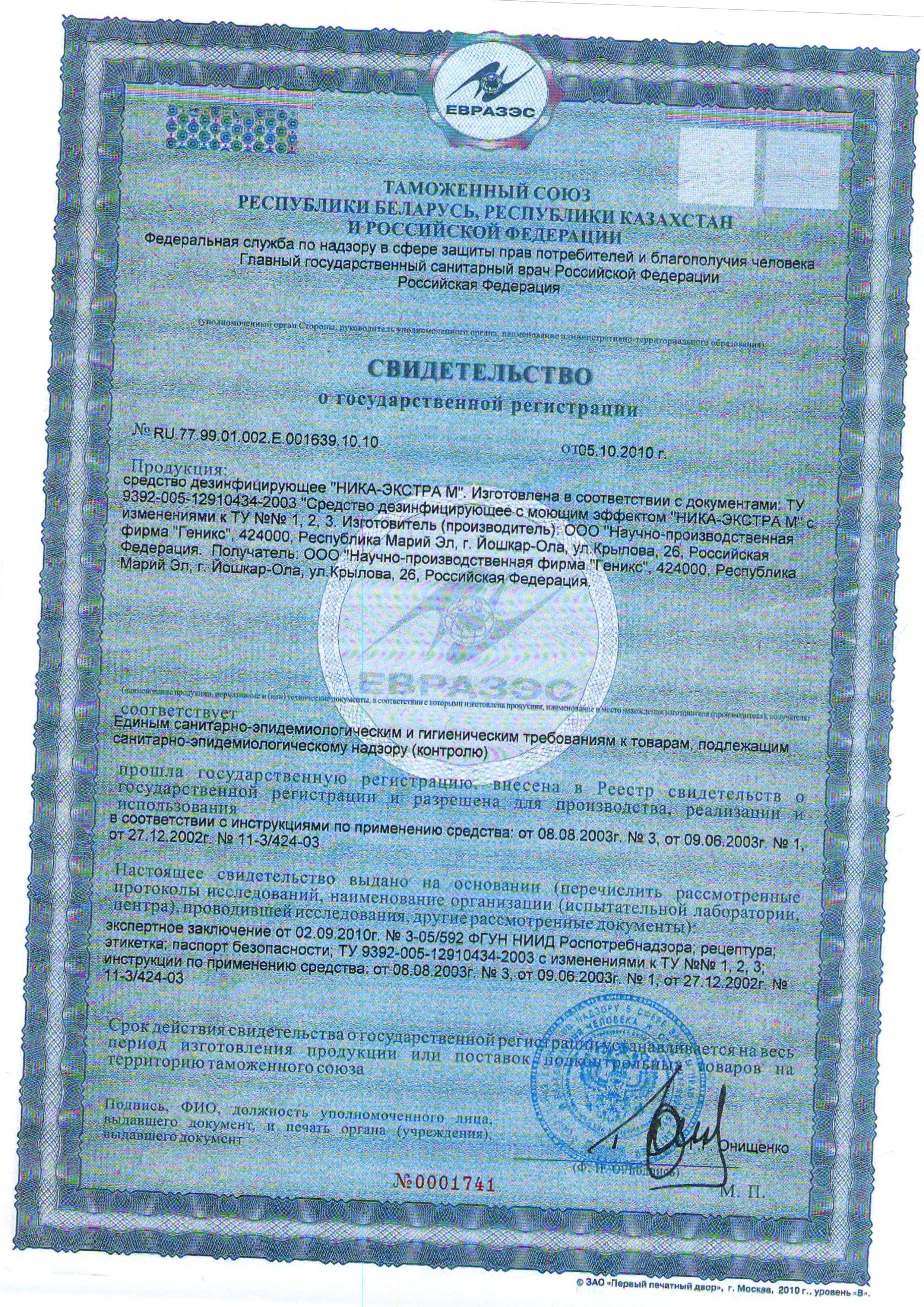 Сертификат на товар - Дезинфицирующее средство с моющим эффектом Ника Экстра М 1 л (концентрат)