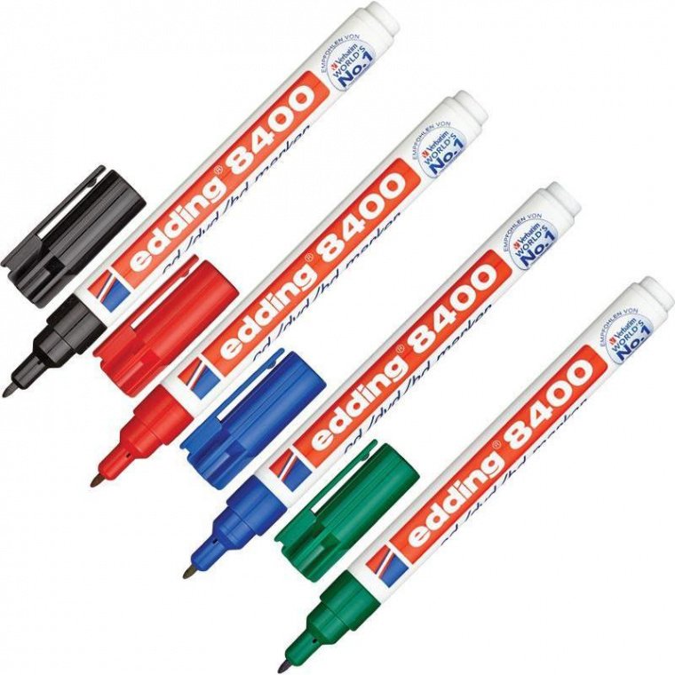 Набор маркеров для CD Edding E-8400/4S. Применяется для надписей на CD, CD-R и DVD-дисках. Не повреждает информацию, хранящуюся на дисках. Стойкие пигментные чернила на водной основе. Водой смыть нельзя. Круглый наконечник. Пластиковый корпус. Толщина линии письма — 0,5–1 мм. Производство — Германия. Цвета — черный, синий, зеленый, красный.