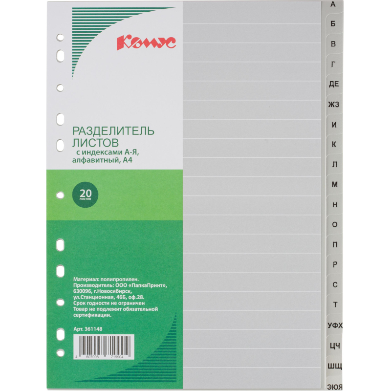Разделители - это отличный вариант для систематизации документов внутри папок разного вида. Они помогают сортировать информацию в том виде, как нужно именно Вам. Разделители листов "Комус" формата А4 изготовлены из полипропилена серого цвета толщиной 140 мкм. Размер - 297x210 мм. Предназначены для учета, классификации и удобной систематизации документов в архивныхпапках. Маркированы по алфавиту, облегчают поиск нужных пози ций.Универсальная боковая перфорация совместима с кольцевыми и арочнымимеханизмами. В комплекте 20 разделителей листов.