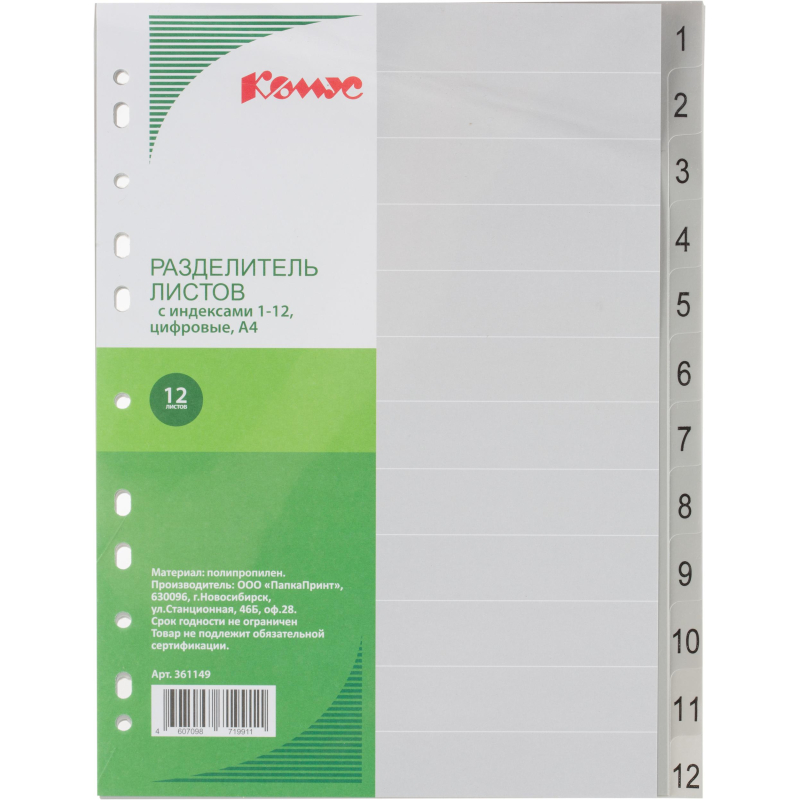 Разделители - это отличный вариант для систематизации документов внутри папок разного вида. Они помогают сортировать информацию в том виде, как нужно именно Вам. Разделители листов "Комус" формата А4 изготовлены из пластика серого цвета толщиной 140 мкм. Предназначены для учета, классификации и удобной систематизации документов в архивных папках. Маркированы цифрами, облегчают поиск нужных позиций. Универсальная боковая перфорация совместима с кольцевыми и арочными механизмами. В комплекте 12 разделителей листов.