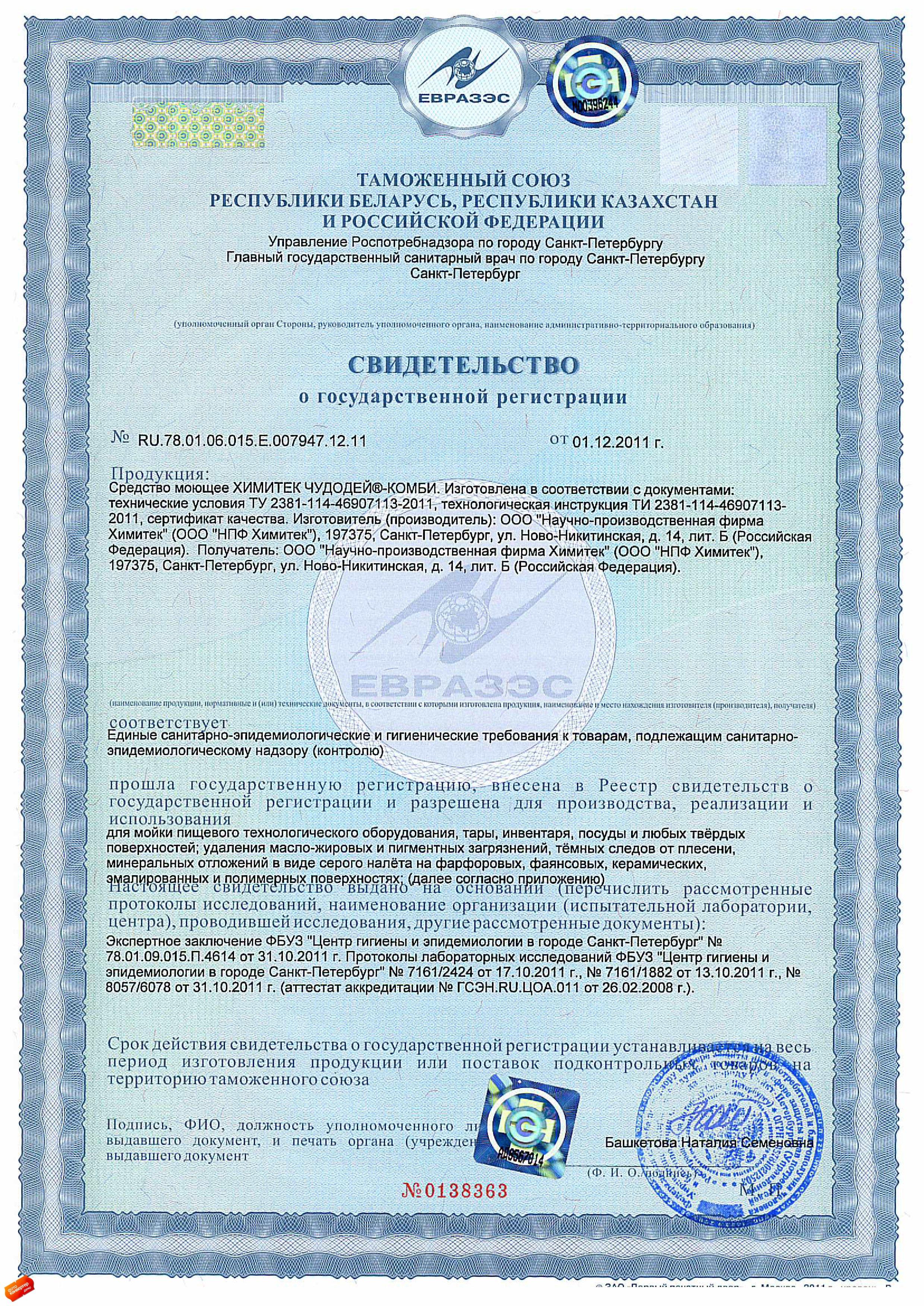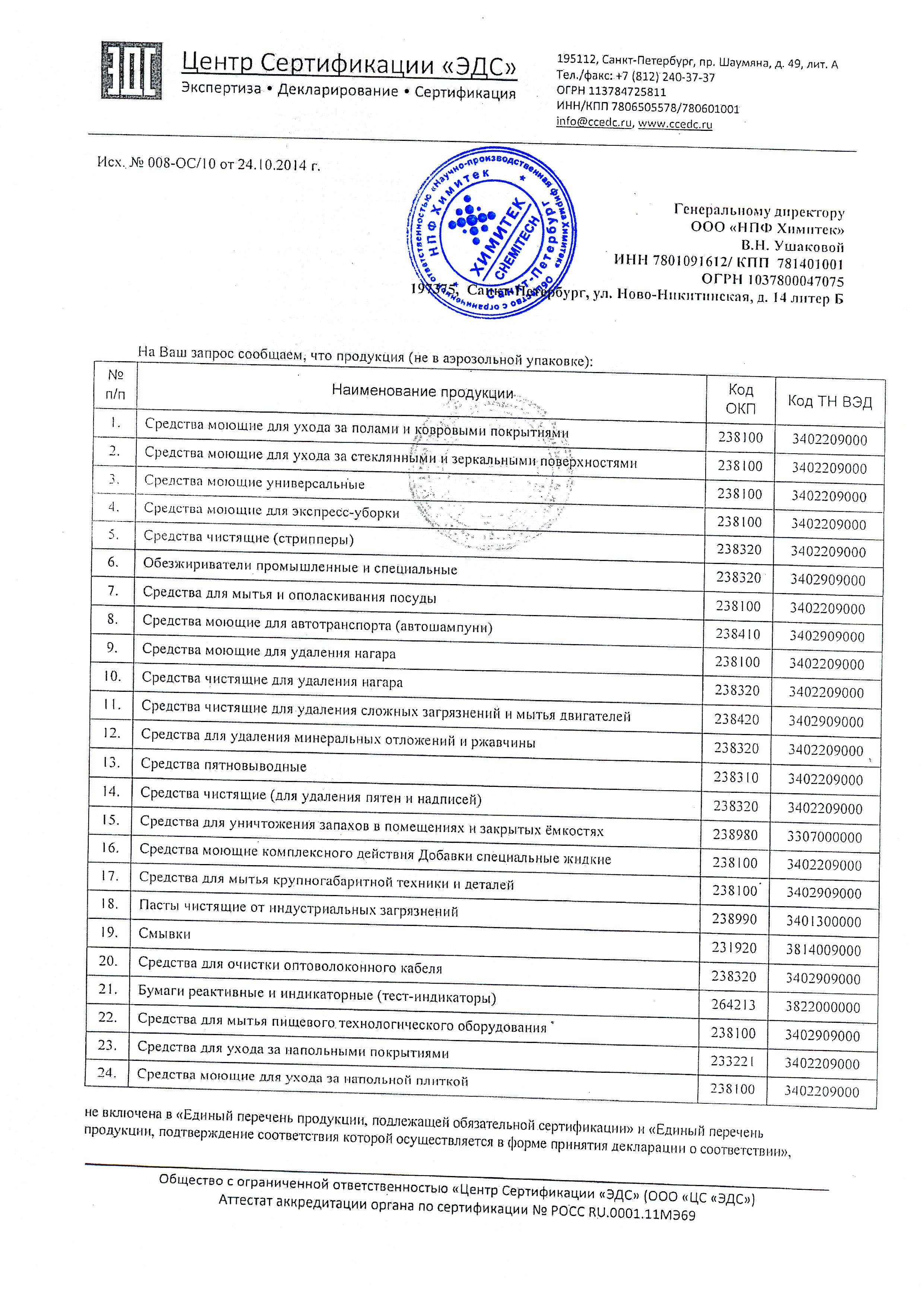 Сертификат на товар - Средство для мойки пищевого оборудования Химитек Чудодей-Комби 1 л (концентрат)